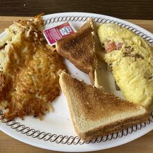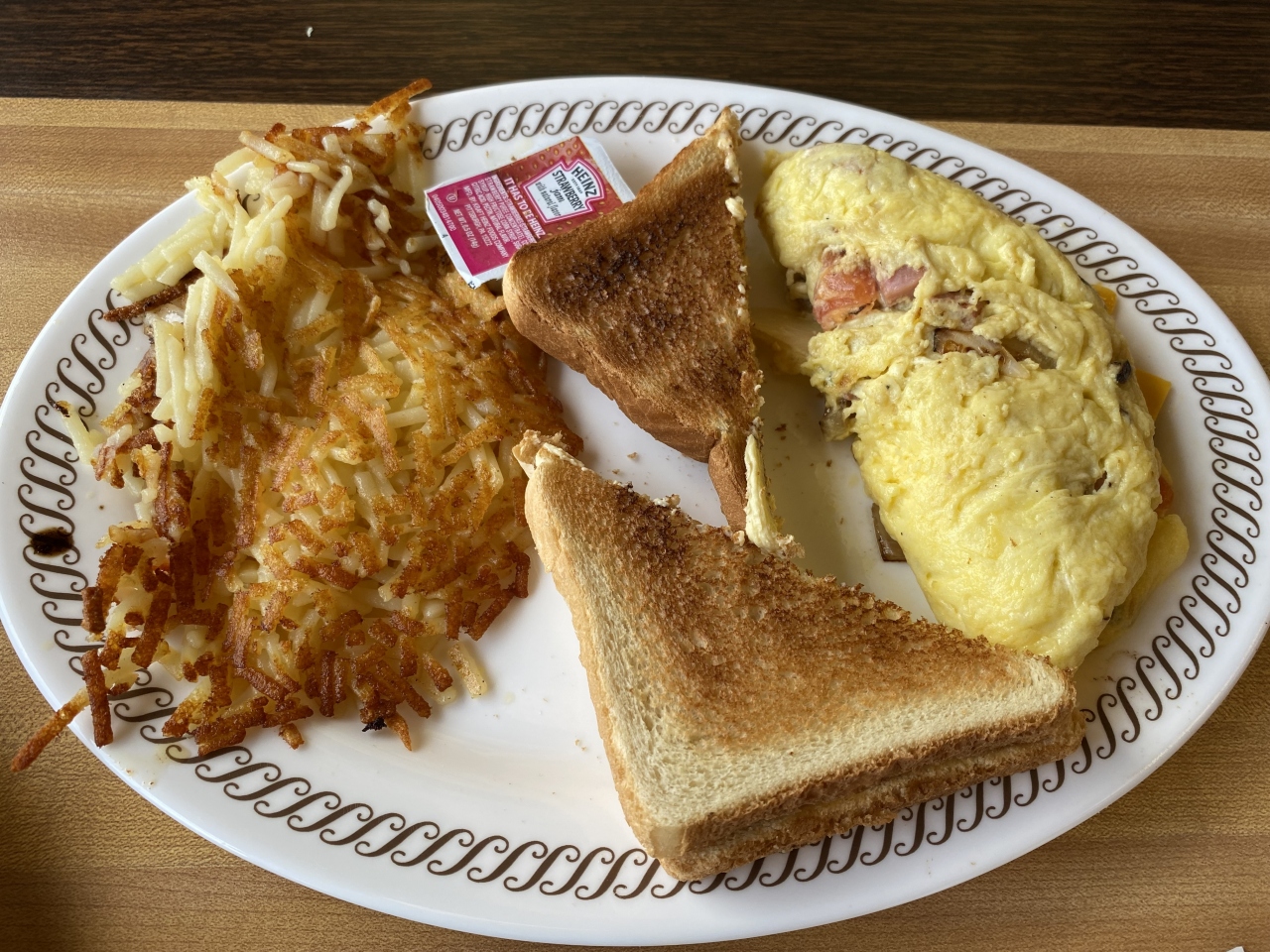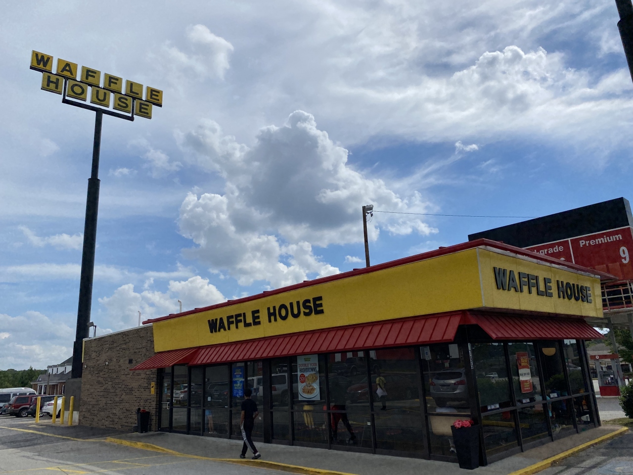 スパルタンバーグのホテルを素泊まりしたので、チェックアウト後に朝食で「ワッフル・ハウス」のスパルタンバーグ店に行きました。ワッフル・ハウスは、アメリカ南部では絶大な勢力を誇るファストフード店で、ちょっとした規模の町には必ずあります。安くてそこそこ美味しいので人気。24時間営業の店も多く、食事どきは結構混んでます。私は大体いつも「オールスター・スペシャル」。但し、これはしっかり空腹の時しかオーダーできません。…というか、しっかり空腹でなければワッフル・ハウスには行きません。妻は大体いつも「フィエスタ・オムレツ」。野菜が入ったオムレツなので比較的ヘルシー。こちらはワッフルは付かないので、オールスターのワッフルを二人でシェアします。とにかく安くて南部の朝食を満喫できる店です。