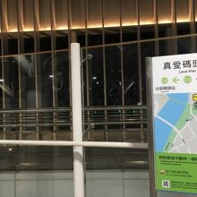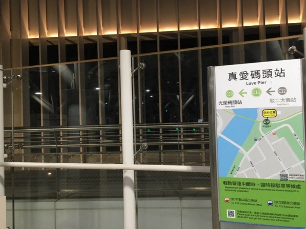高雄の漁港のそばを走るLRTの駅です。海岸エリアのライトアップや水の揺らぎ具合が見えました。駅近くの愛河もきれいにライトアップされていました。踏切みたいなところは、人が出入りするので、かなりカンカンなっていました