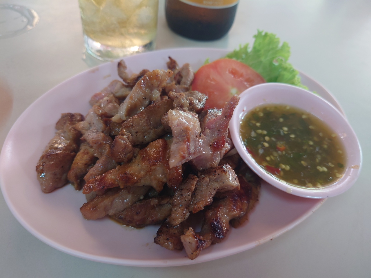 メニューは豊富で迷うが、大好物のガパオムーサップ。コームーヤーンを頼んだがメニューにはなくムーヤーンならあると言うのでそれにした。