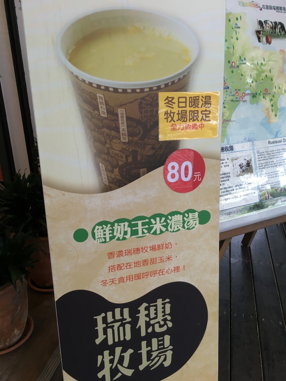 コーンスープ、ミルクのアイス、ケーキなどを買いました。生の牛乳も大変おいしかったです。牛がすごく元気に草を食べていました。茶色の牛は、食用で白黒の牛は乳牛のようでした。コーンスープは80元で冬限定商品でした。