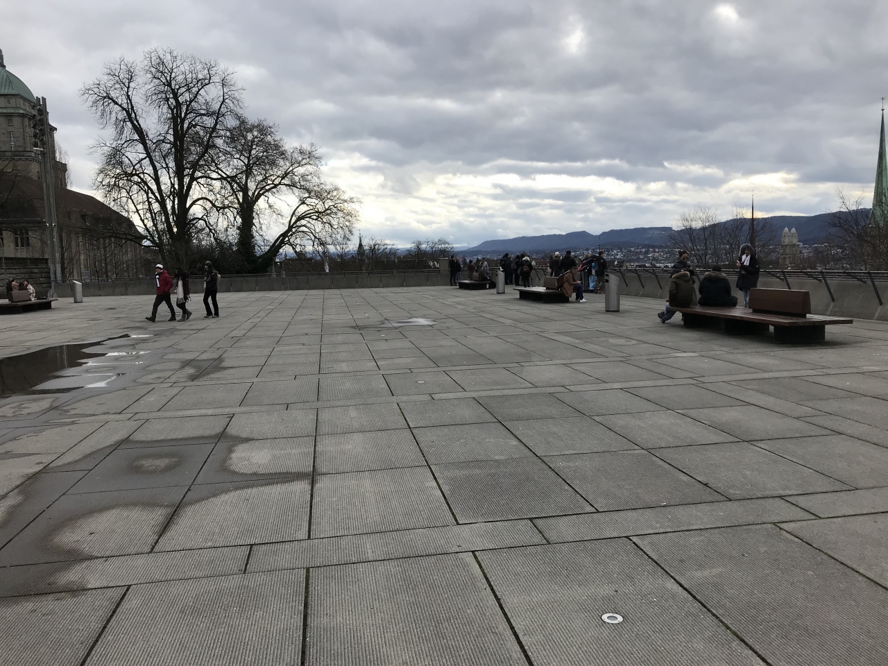 赤い車体が可愛いケーブルカーのUBS ポリバーンで丘の上に上がると、この展望台があります。チューリッヒではリンデンホフの丘からの眺めが有名ですが、この反対側の展望台から見る景色も捨てがたいものがあります。