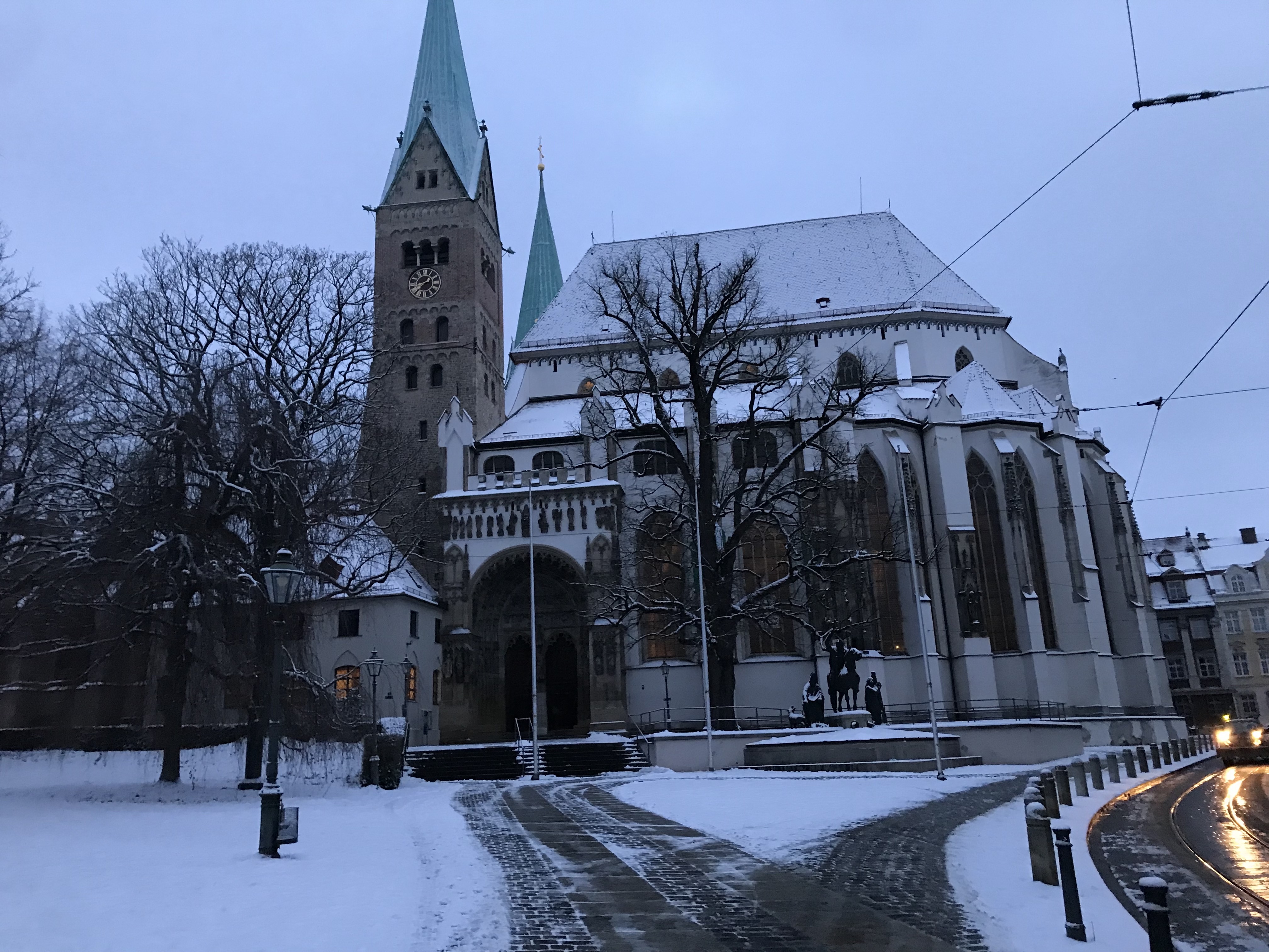 アグスブルク市庁舎から北へ歩いて10分ほどの場所にありました。朝早く行ったので、開いているかわかりませんでしたが、扉が開いたので中に入ってみると、ちょうど朝のミサの最中でした。ステンドグラスを見たかったのですが、ミサの邪魔をしてはいけないのでやめました。雪を被った外観も素敵でした。