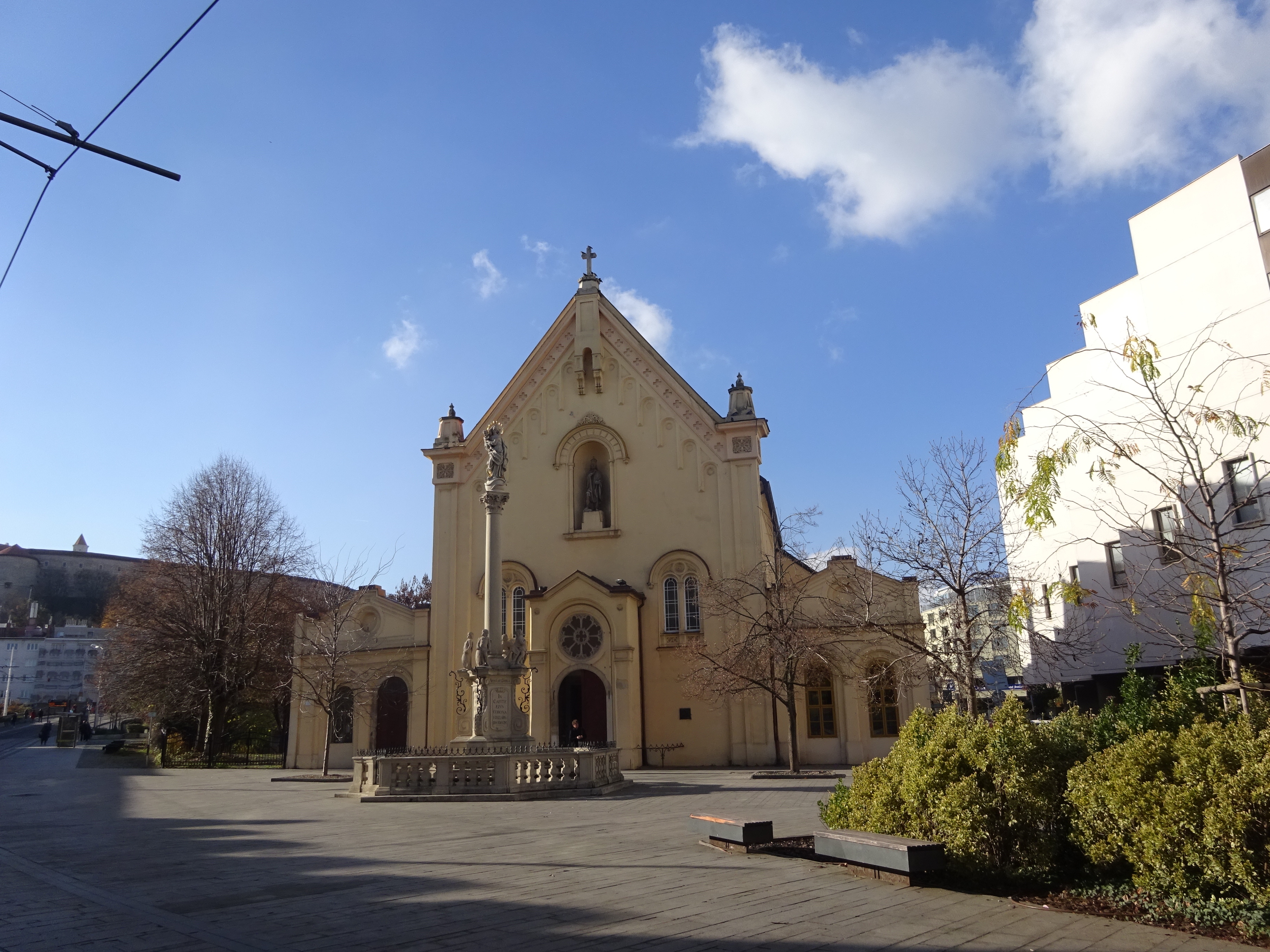 ブラチスラバのミハエル門の北側にある教会です。ミハエル門からは、歩いてすぐです。時間か曜日か分かりませんが、開いておらず中は見られませんでした。外観は割と新しめで、教会の前に美しい塔がありました。中も見たかったです。