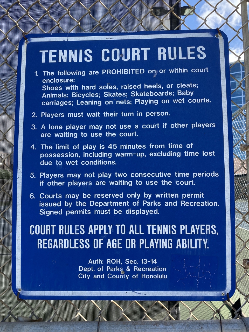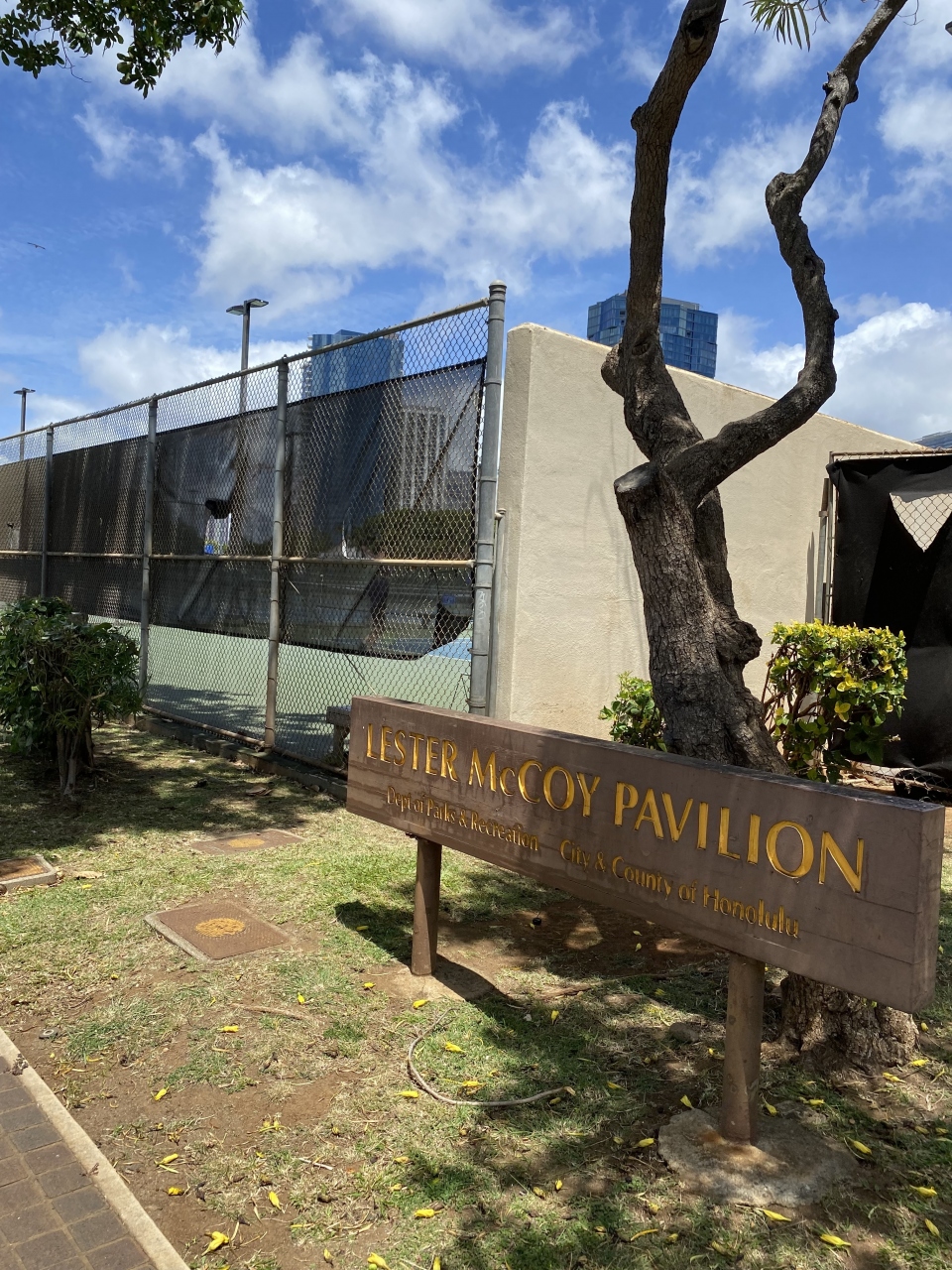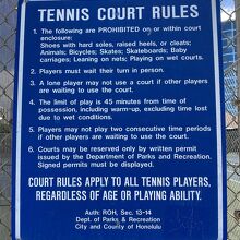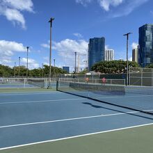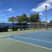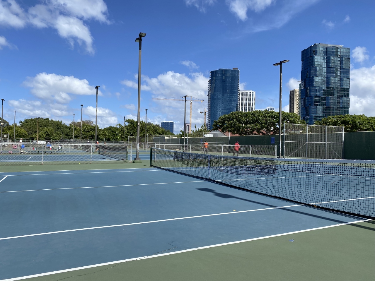 アラモアナビーチパーク内にあるパブリックのテニスコートです。10面位ありますが、無料で利用できることもあって結構混雑しています。ただ、ルールとしては1回の利用が最長45分なので、各コートの入り口に人が待っていたら交代しなければなりません。コート待ちの人がいなければ待機者が出るまでプレイしていても問題ありません。土日の午前中は地元のテニスサークルの人たちで結構混雑しています。駐車場は無料で、公園内の道路に縦列駐車します。テニスコート内は日陰がないので熱中症にはご注意ください。