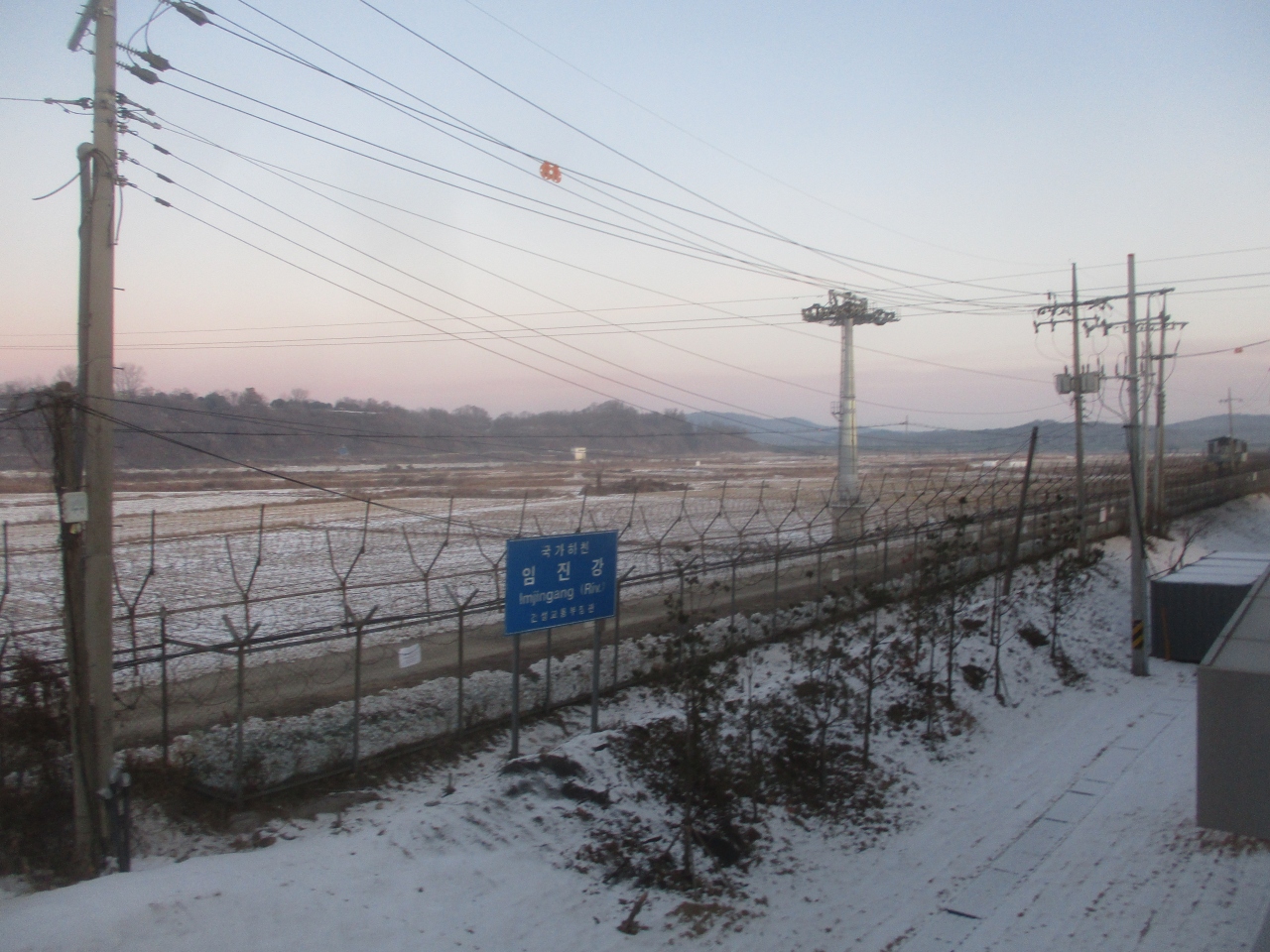 臨津閣と呼ばれる建物の屋上に上がりました。極寒でしたが快晴で臨津江の対岸が良く見えました。対岸はまだ韓国の制限エリアですが、遠くに見える山の向こうは、北朝鮮です。南北連絡鉄道の真新しい鉄橋が臨津江に掛かっていて、いつでも北へ直通運転できそうな感じでした。
