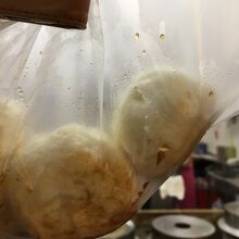 ミニサイズの肉まんで、あっというまに一口でなくなってしまいました。ビニル袋にまとめて、入れて渡されます。醤油みたいのも一緒に袋にぎゅっと入れてしまうので、しみてしまうから早く食べた方がいいよとか言ってほしかったです。