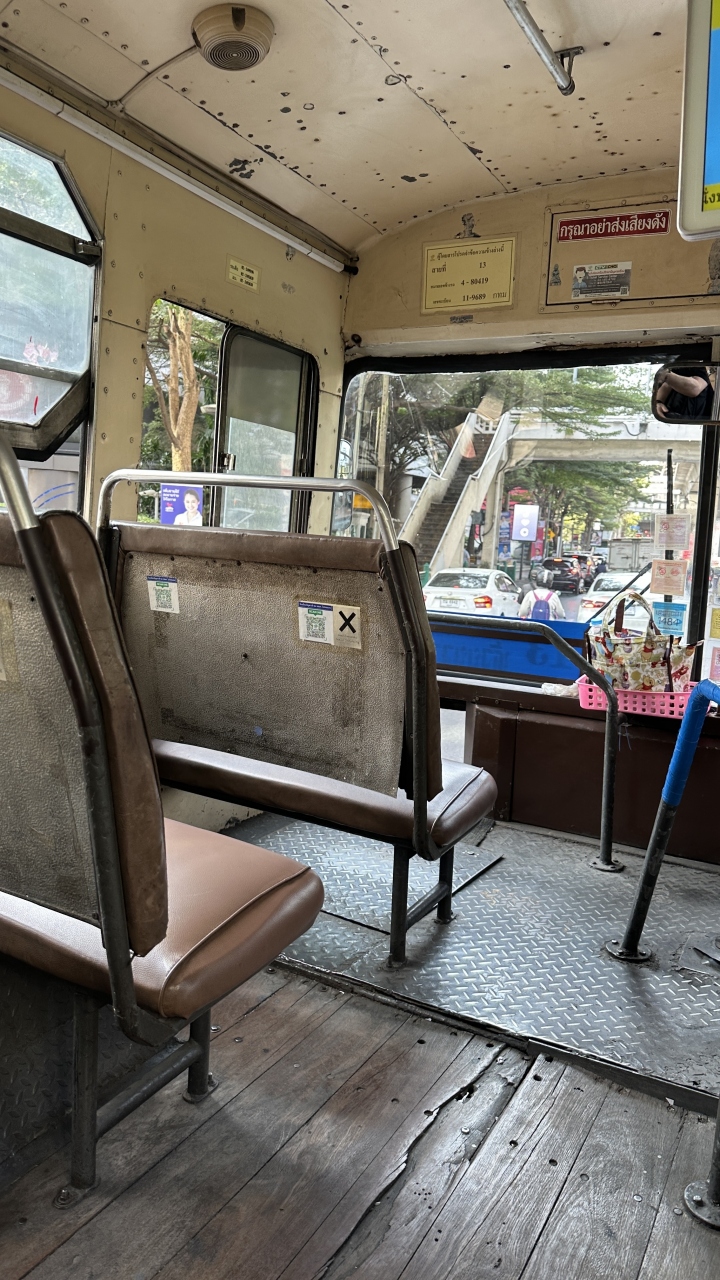 幼少時に住んでいたバンコクにはこのバスしか公共交通機関がなかったのですが、いまでもバスしか無いエリアはまだまだあります。冷房なしのバスも徐々に減ってきていますが、まだまだ現役。カチャカチャ言いながら料金を回収する車掌さんもいて懐かしい気持ちになりました。ただ、モニターがついて停留所名を案内してりするなど、アップデートもされていました。