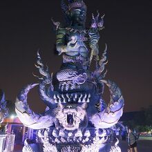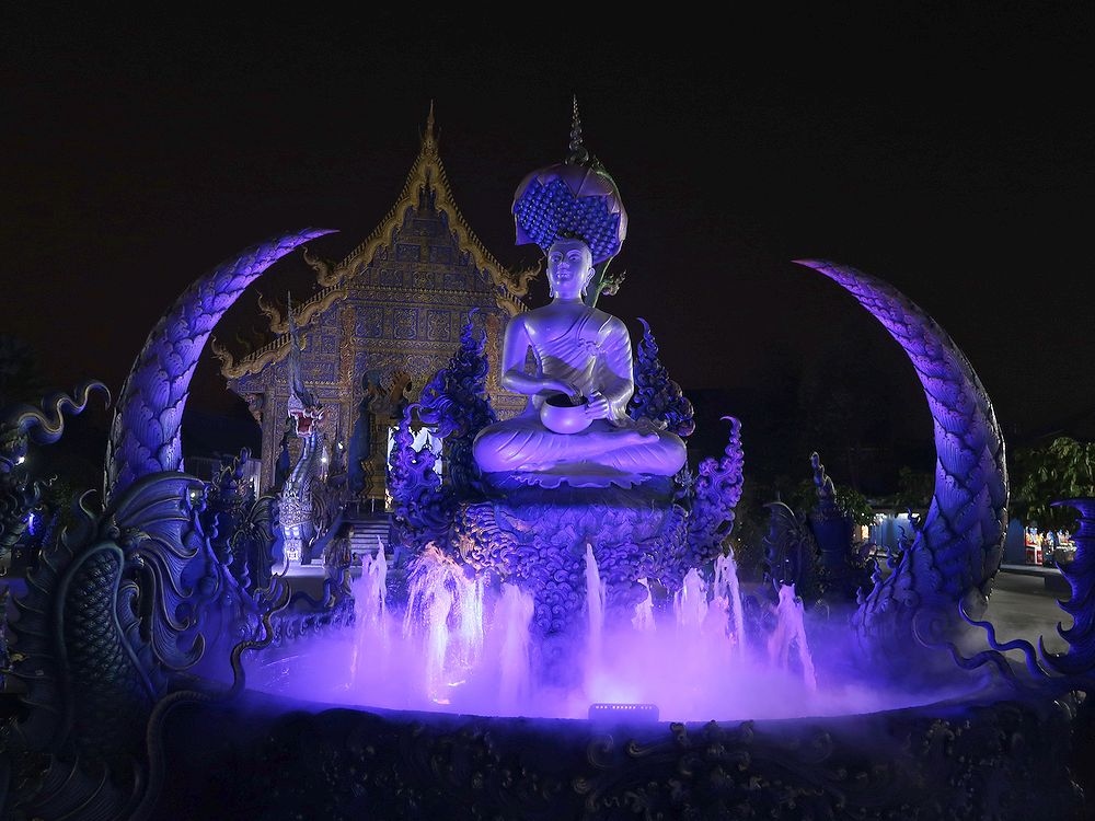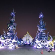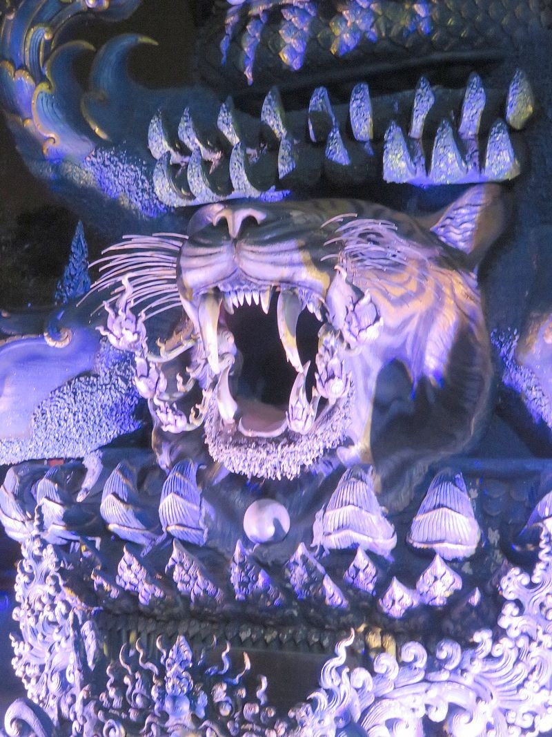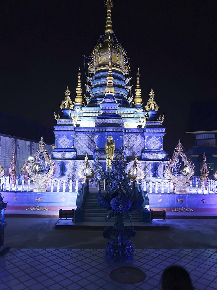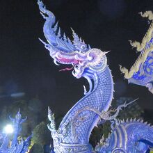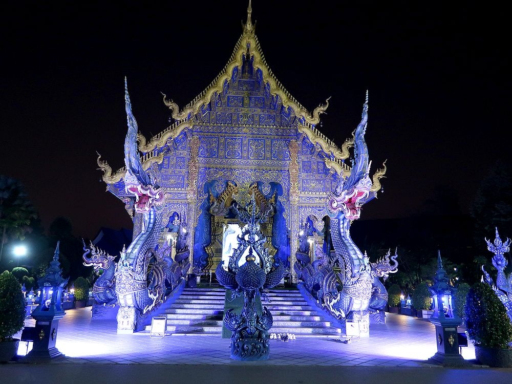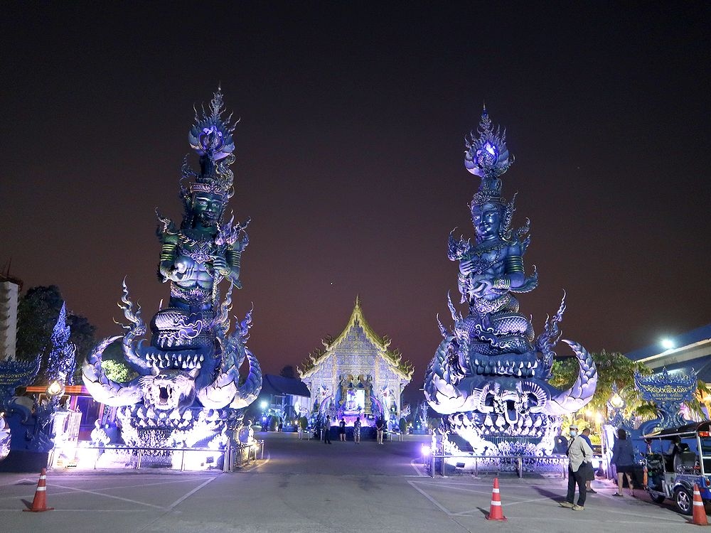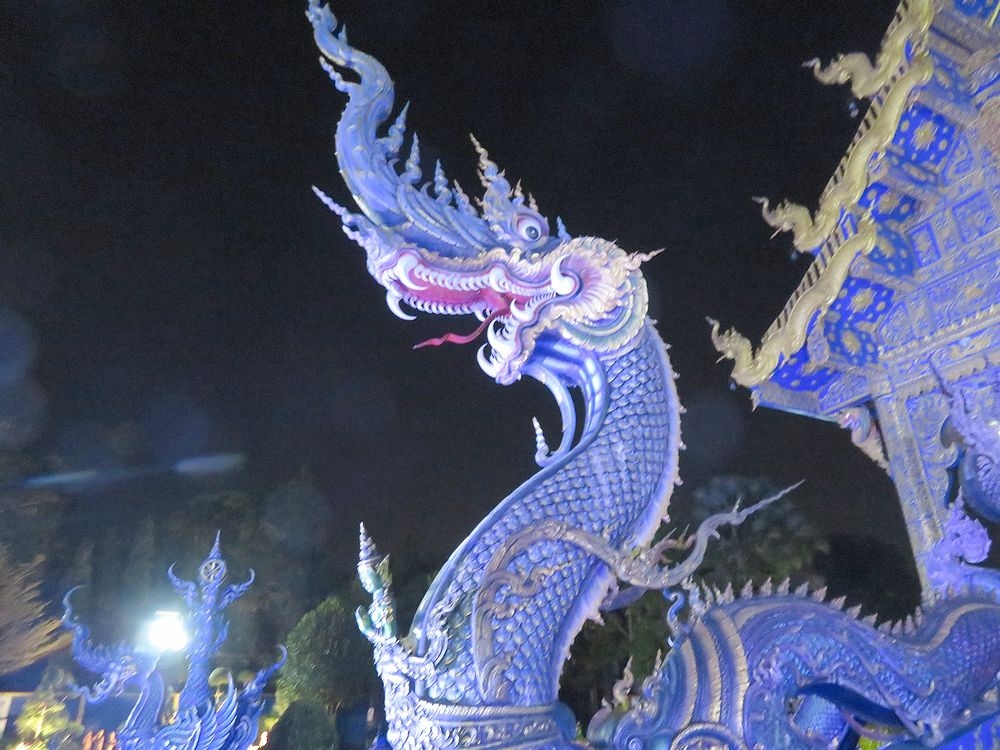 1月末、チェンライの宿の主人から夜がいいよといわれたので、夕食後にtuktukをバスターミナル前で拾って行きました。往復で180バーツ(720円)で行ってくれました。ブルーテンプルといわれるだけあって、夜のほうがブルーが強調されたように思います。昼間は真っ白な本尊も、夜はブルーでした。チェンライの街中から歩いていけるようなことがガイドブックに書かれていたので、当初私達は途中まで歩き、だめなら途中からTuktukで行こうとしましたが、Tuktukやタクシーも拾えず(通らず)、そのまま行くのは断念したのでした。Tuktukはバスターミナル前に止まっていることが多いようです。けっして高くはないので、Tuktukをチャーターすることをお勧めします。