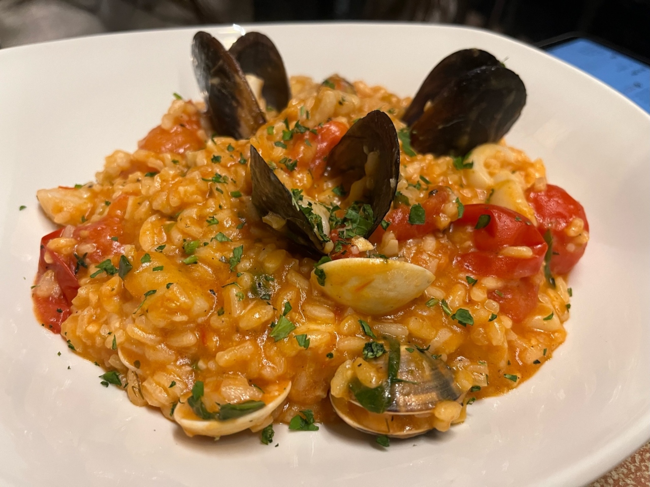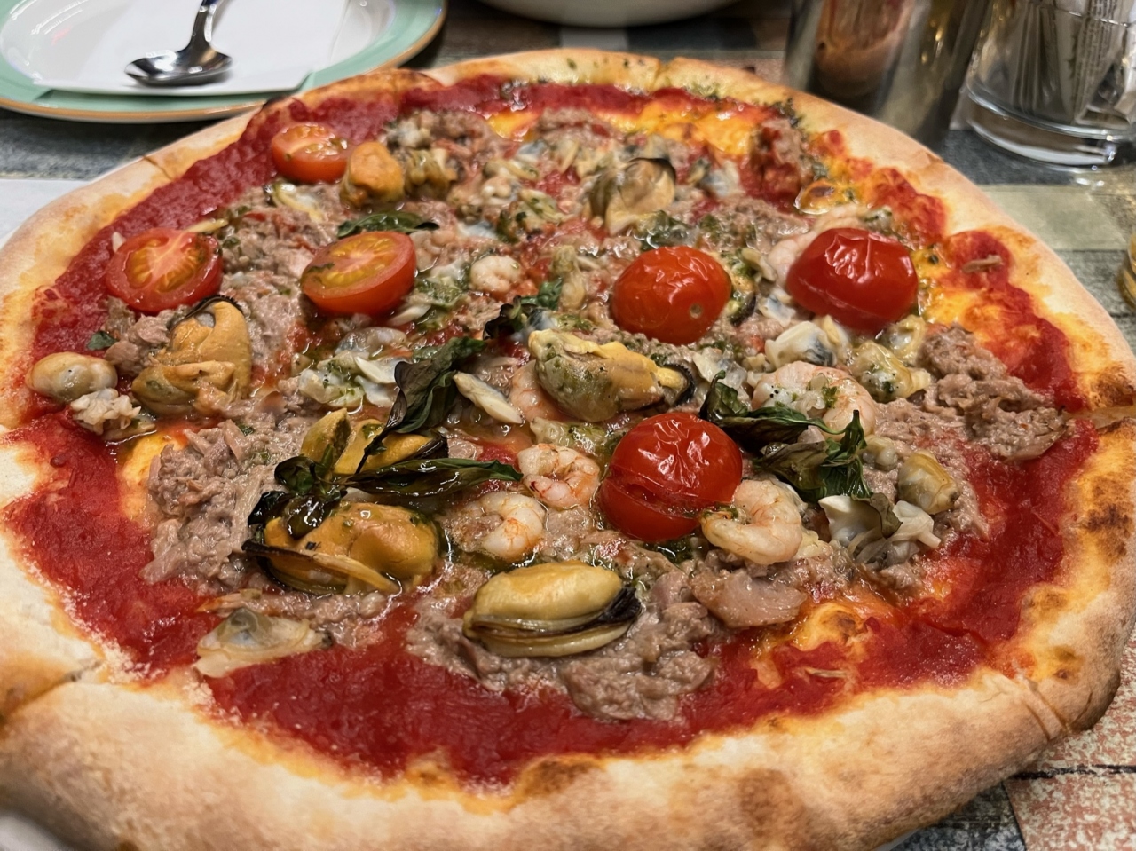 スピノーラ湾を眺めながらテラス席でお食事を楽しめます。私が行ったのは2月だったので少し寒かったですが、雰囲気よくゆっくり出来ました。注文したシーフードピザは、ラファエルピザという名前でメニューにお店の名前がついたピザ。トッピングにたくさんのツナが乗っていて、海鮮の風味が豊かでめちゃくちゃ美味しかったです。他にお願いしたリゾットもすごく美味しくて大満足のディナーでした。