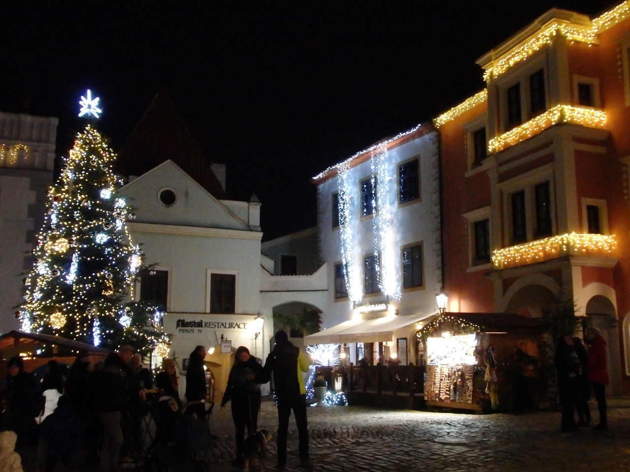 チェスキー・クルムロフのバスターミナルから徒歩15分近く、石畳の通りを歩いて到着したスヴォルノスティ広場も石畳で覆われた中世の雰囲気が残る空間です。周りを取り囲むのは個性豊かなデザインの形をした屋根とパステルカラーの壁面を持つ建物達。それぞれカフェ・レストランやお土産物屋さんが入っています。一角にはペスト終息を記念して建てられた記念柱が建ち、南に面した建物には観光案内所があります。年末にはクリスマスマーケットが繰り広げられ観光客の人気を呼んでいます。