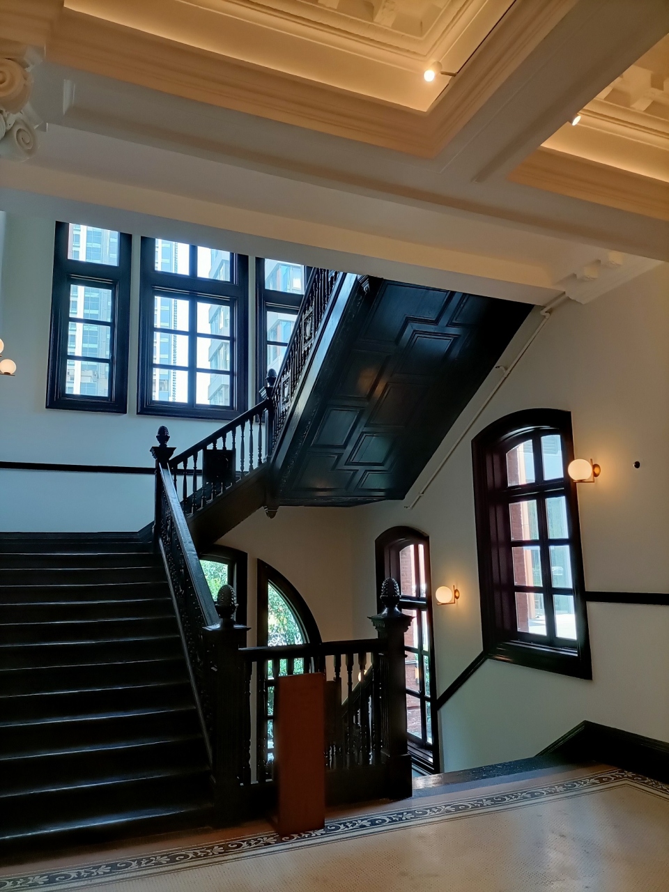 人民広場周辺から上海の蘇州河を北に四川北路を渡り、郵政博物館を見学したのち西に進むみ、こちらの【旧上海総商会】を見学しました。蘇州河そばには、ヨーロッパの都市で見られる凱旋門を彷彿とさせるような石づくりの立派な門があり、その脇の道路を北にすこし歩を進めると、赤レンガ造りの外壁とライトグレーの柱が絶妙なバランスの、シンメトリーの3層の建物が左手に見えてきました。常時開放されているのではないようですが、訪問時は丁度イベントをやっており、1913年竣工のこの建物の中に入ることができました。一歩中に足を踏み入れると、高い天井と、上層へ続く木製の手すりの美しい階段、細かなタイルを使って絵柄を表現した床など、見ごたえのある内装を見学することが出来ました。