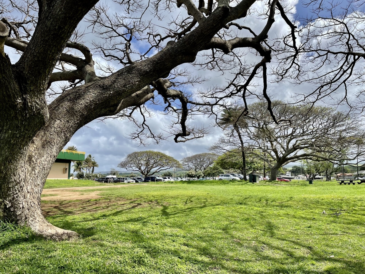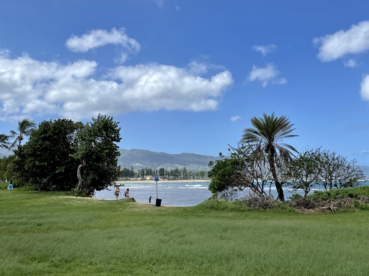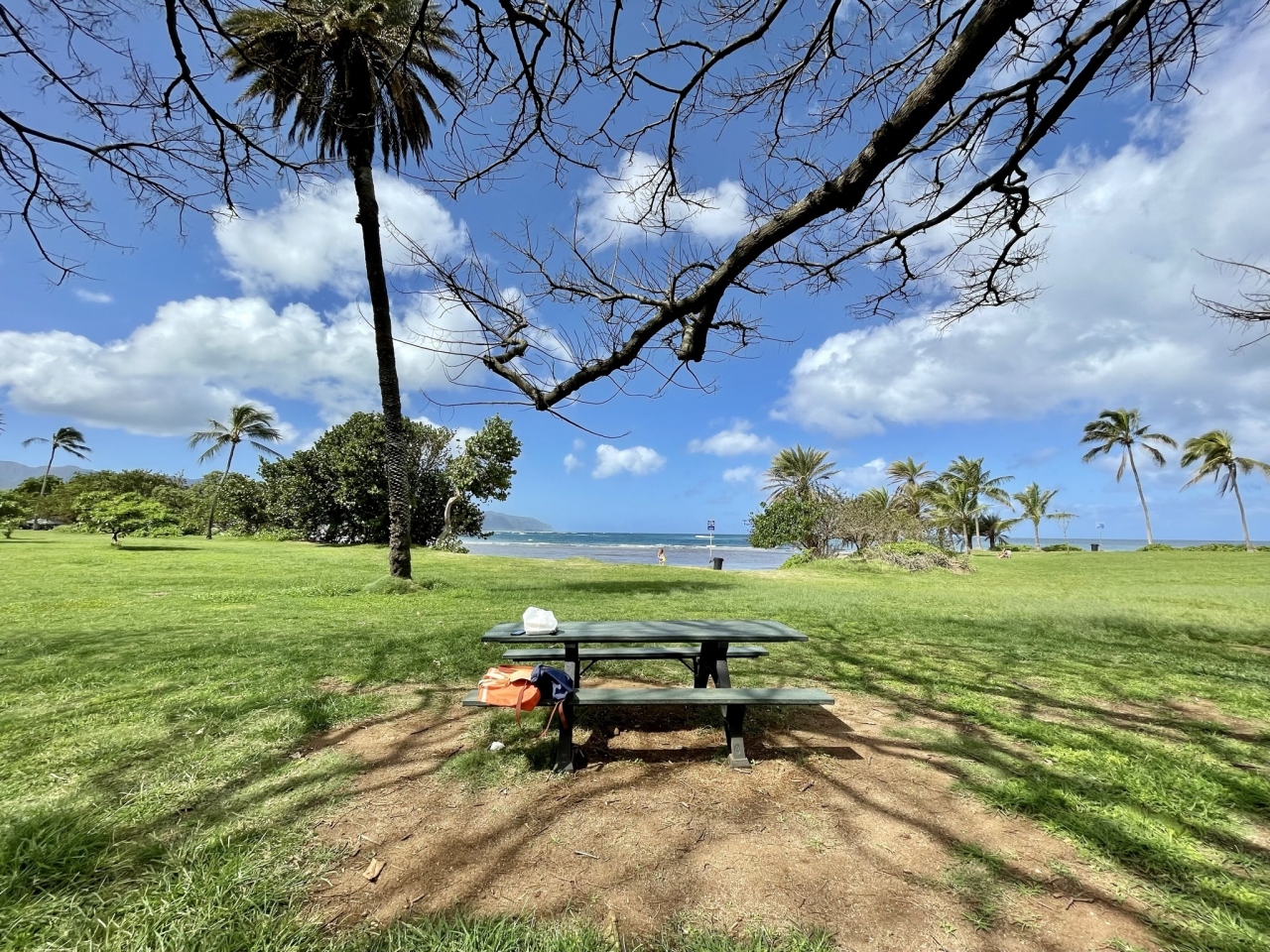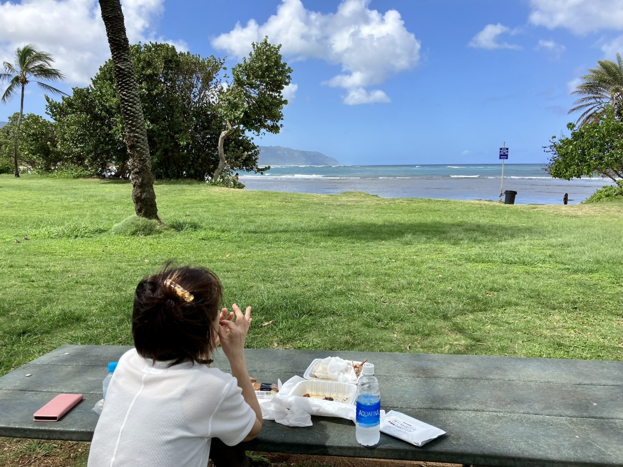 ノース方面に行く時には必ず立ち寄るビーチパーク。広い芝の公園にテーブルセットが点在しており、そこでハレイワのレイズフリフリチキンとマラママーケットのスパムむすび、またはガーリックシュリンプのプレートランチを食べるのが定番です。私が行った時には、同じようにチキンをほおばる日本人女性二人もいました。
