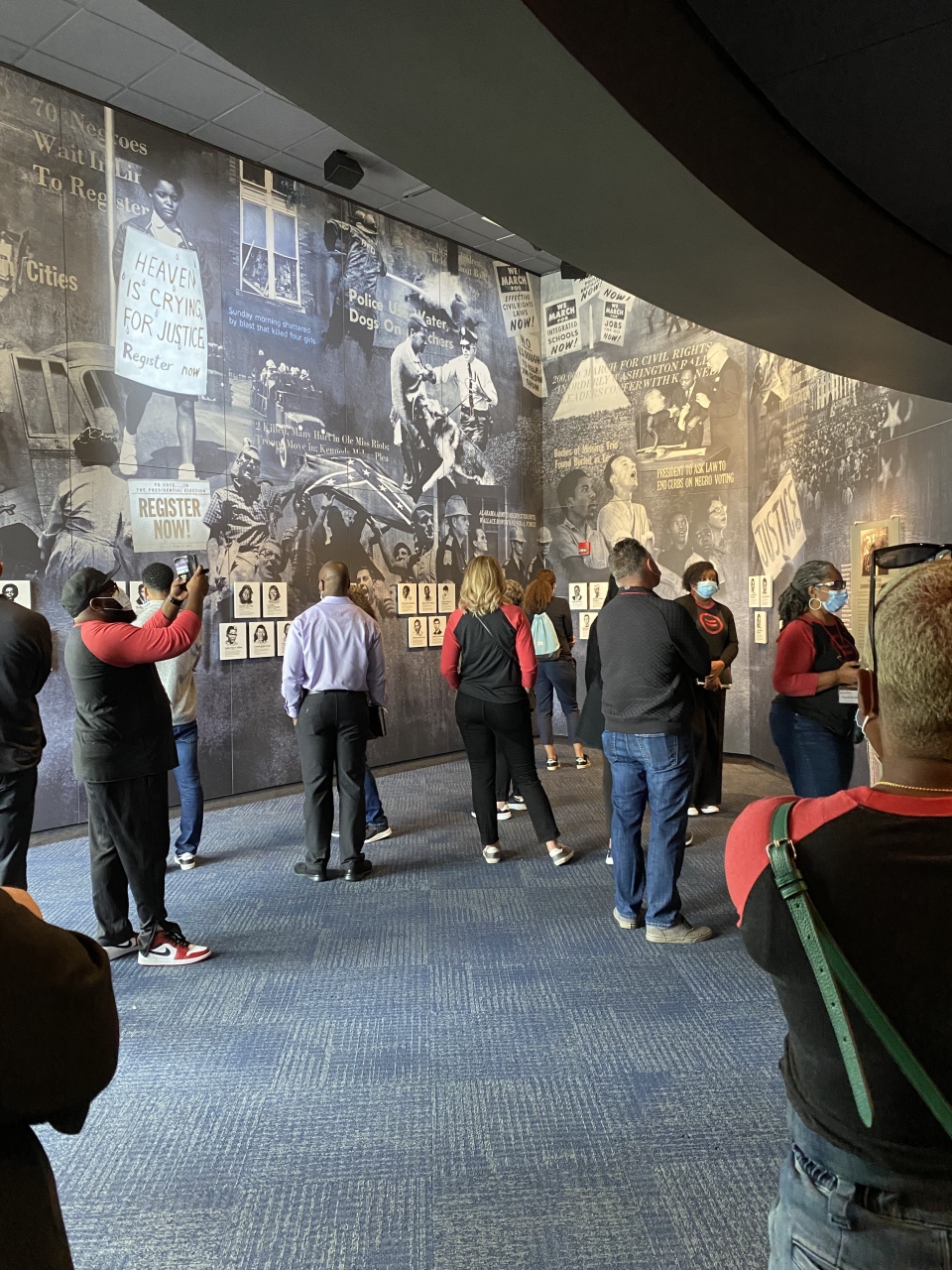 市街中心部、アラバマ州議事堂から徒歩にて「公民権メモリアルセンター」へ、奥の大きな建物は南部貧困法律センターです。建物の手前には、キング牧師の”正義が水のように、正しさが力強い小川のよう流れるまで...”という言葉が刻まれた花崗岩。このメモリアルセンターには、1954~68年の間の公民権闘争で亡くなった人々の名前が刻まれています。館内はガイドツアーになります。先述の公民権闘争に関するイントロダクションが、ご覧の会場でプロジェクションマッピングにて紹介されました。その後、映像ホールにて公民権運動の紹介ビデオが流され、簡単な質疑応答セッション。どこかの団体が熱心に応答していました。ここじゃないと見れない、という内容でも無いかな...ガイドツアー待ちとセッションが面倒でなければ。
