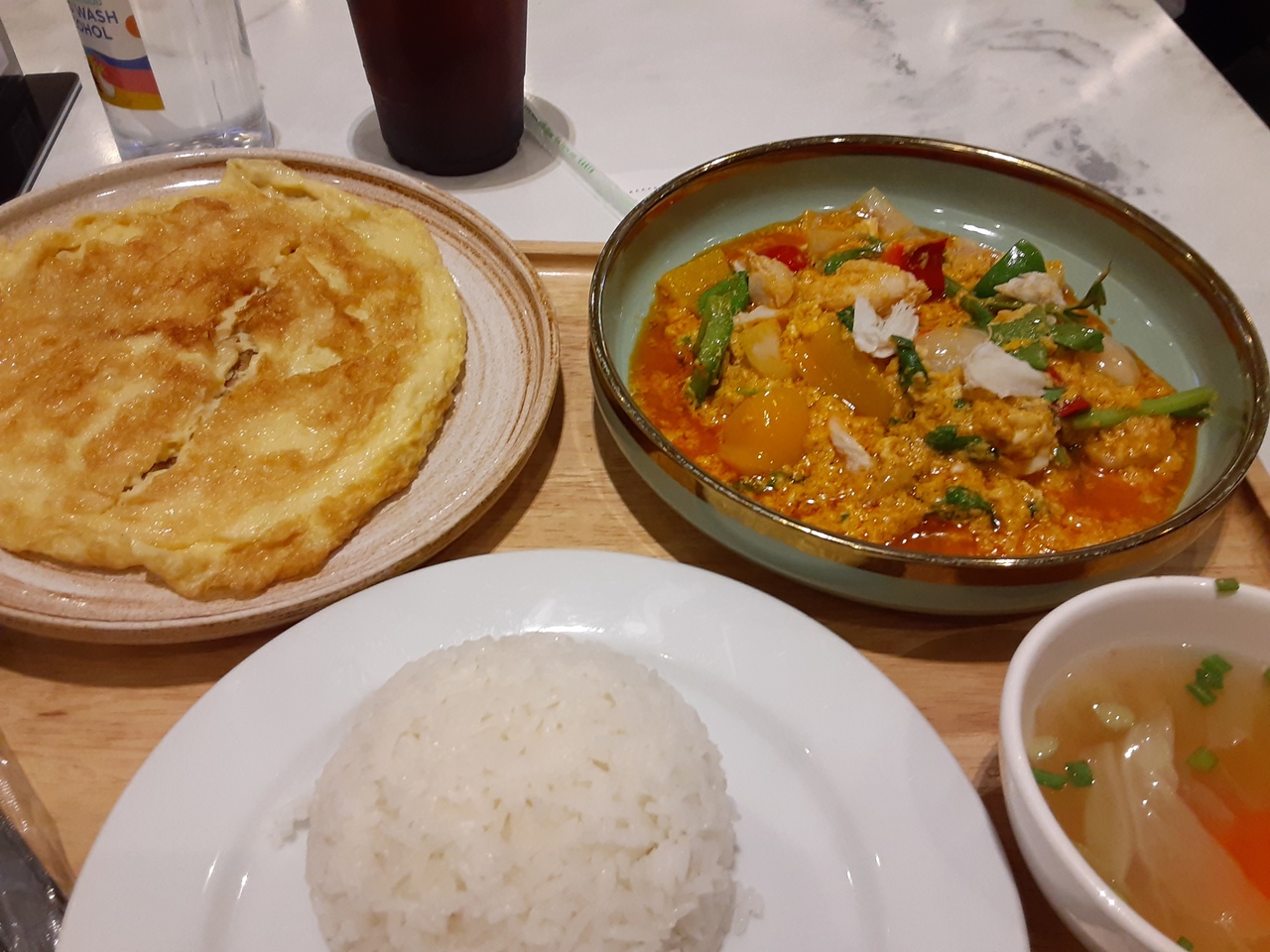 レストランエリアは出国審査、免税店エリアを過ぎたあたりにある。今回はASIAN Cornerというタイレストランを利用。プーパッポンカレー風の定食が580バーツ(2,300円くらい)、アイスコーヒーが130バーツ(500円くらい)と、合わせて3,000円近くとなった。味は悪くなかったが、いくら空港内とはいえ、タイの物価からは割高に感じた。