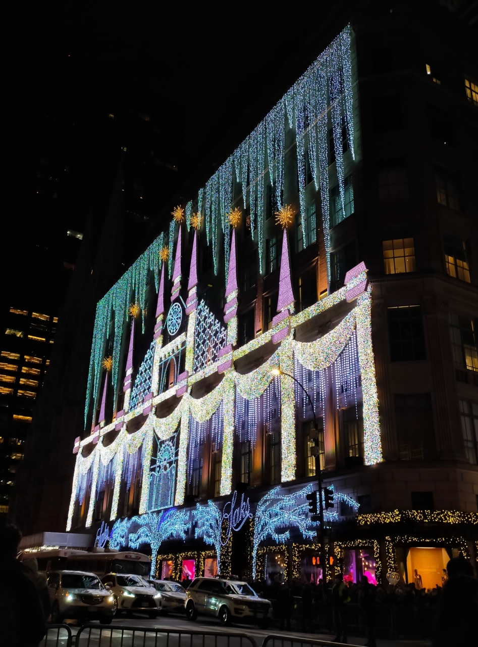 5th Aveからクリスマスのライトショーを見ました。5th Aveは交通量が多くて忙しい通りですが、そんな中でも派手なライトショーをやっていました。3分弱?くらいの長さで、音楽も流れていていました。誰でも足を止めて見入ってしまいそうな素敵なライトショーでした。
