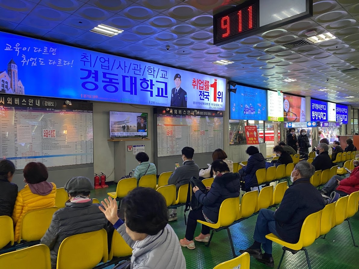 バスターミナルの規模の割りにローカルな施設なので観光客に向けた電光掲示板とかアナウンスとかは無いです。ハングルが読めなければ乗車時間とバスの出発口の番号をしっかり確認しましょう。運転手さんにチケット渡す際に確認してくれるので大丈夫だと思いますが。