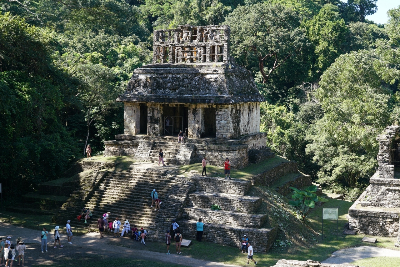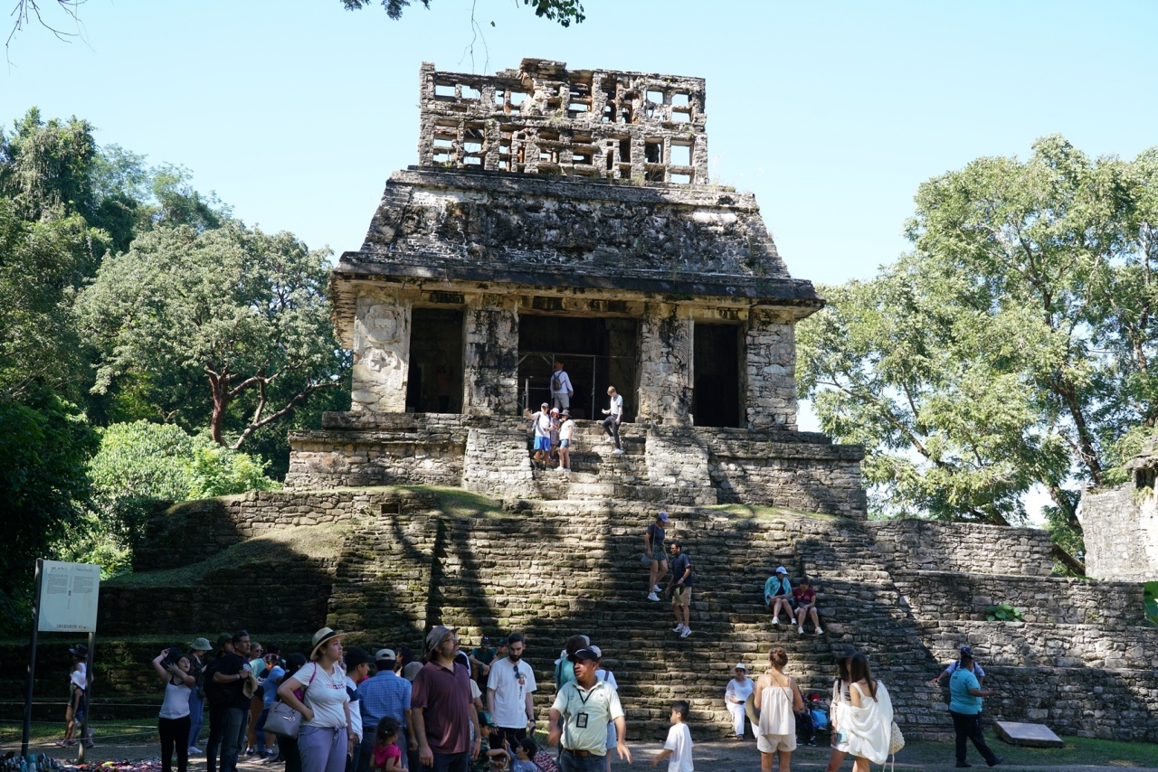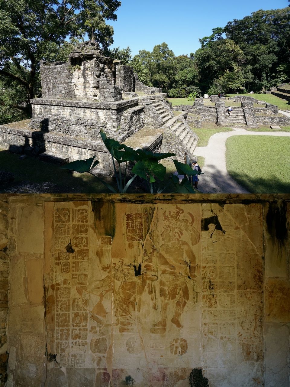 大きな建物ではありませんが太陽の神殿も登って内部を見ることができます。神殿の奥の壁画の中央には、盾と槍で象徴される「戦さと太陽の神-L」が描かれています。なおすぐ隣には14号、15号神殿があり、「14号神殿」は案内板によると、「明らかにKan Joy Chitam2世によって、その兄で先代であるKan B'ahlam2世(パカル2世の後継者でSerpiente Jaguar)へと捧げられたもの。壁画に描かれているシーンは、Kan B'ahlam2世が水際で踊っていて、その前で母親が王族に関係の深い神K(K'waiil)の像を捧げている所。