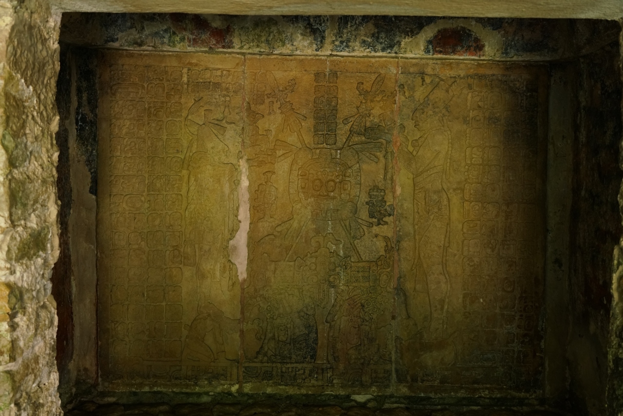 壁画が描かれたのは2人の死後。マヤ文明では統治者はタイムトラベルできると信じられていたので、統治者が祖先と会うシーンが描かれることがあった。」とのことです。