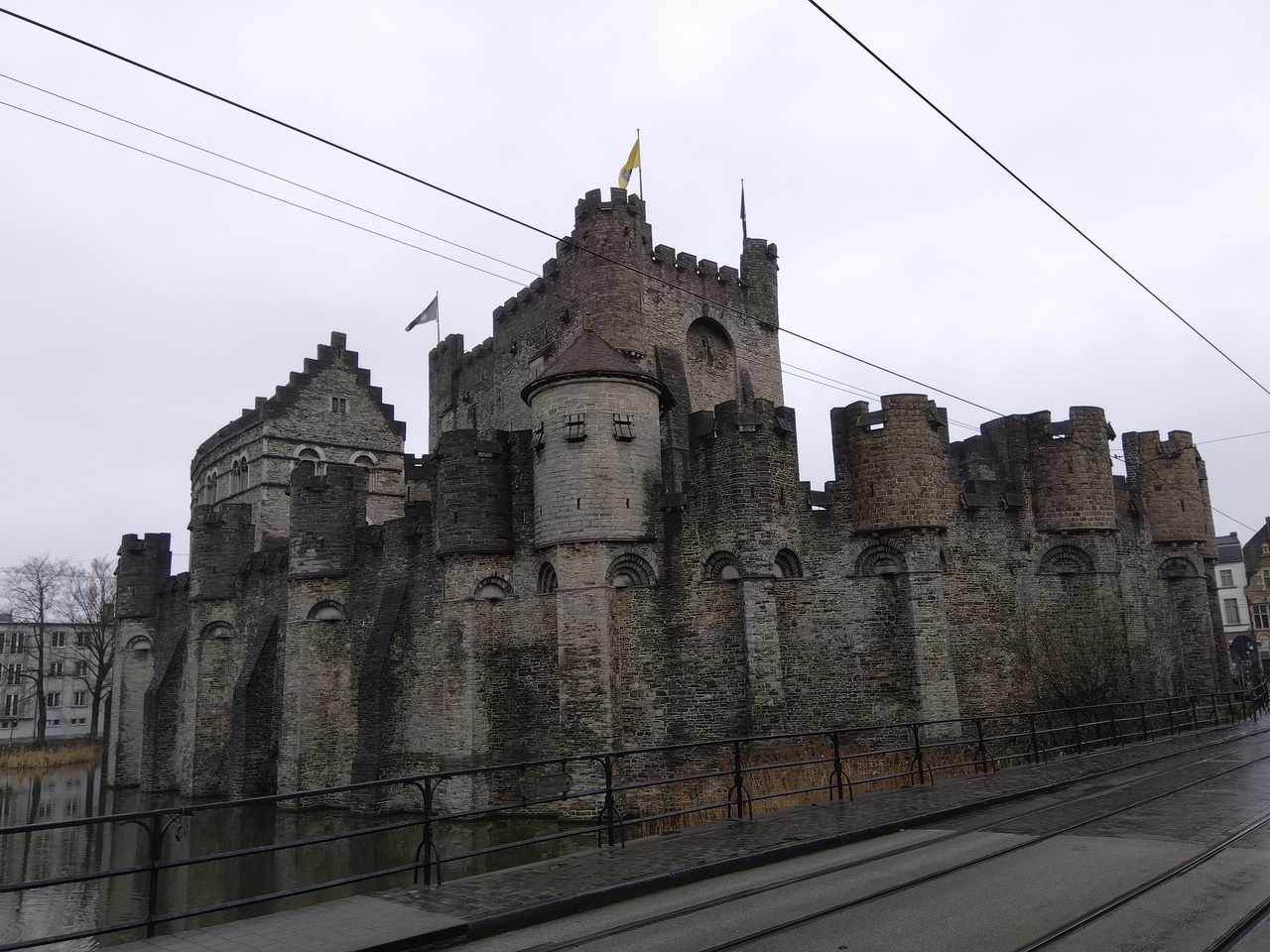 ゲントの中心部から歩いて行ける場所にあり、目の前をトラムが走っています。レイエ川沿い、ヴェール広場にも面しています。17世紀以降のヨーロッパのお城と異なり、堅固な要塞といった感じで趣きがあってよかったです。