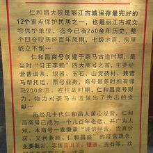 麗江を訪れた際、【木府】にほど近い場所にあるこちらの【仁和昌】の重厚な建物が目に留まりました。かつての商家でお茶や玉石、馬を使った輸送などを手掛けていた旨、入口の説明板に詳しく記載されていました。麗江で12軒ある重点保護歴史民間建築の一つに指定されていて、屋根の扇垂木なども確かに見ごたえがありました。