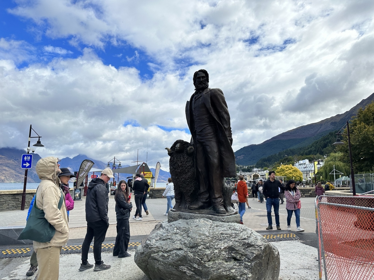 クイーンズタウン市街の中心にあるクイーンズタウンモール、そのワカティプ湖側の入口近くに、ヒツジを連れたウェイリアムリース(ウィリアム・ギルバート・リース)の銅像が立っています。ワカティプ湖を背に、クイーンズタウンの街を見つめている像です。
