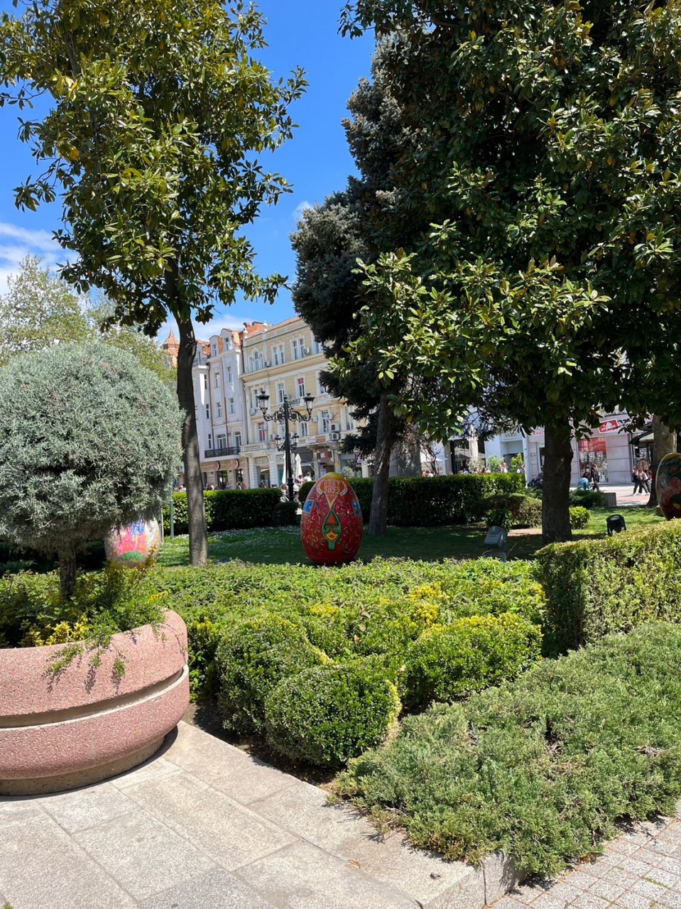 プロブディフ中央鉄道駅や南バス停からプロブディフの旧市街へ向かう途中にある広場です。噴水がランドマークだそうですが、今は臨時休業中でした。イースターのシーズンだったからかペイントされたイースターエッグが何個も設置されていてかわいかったです。
