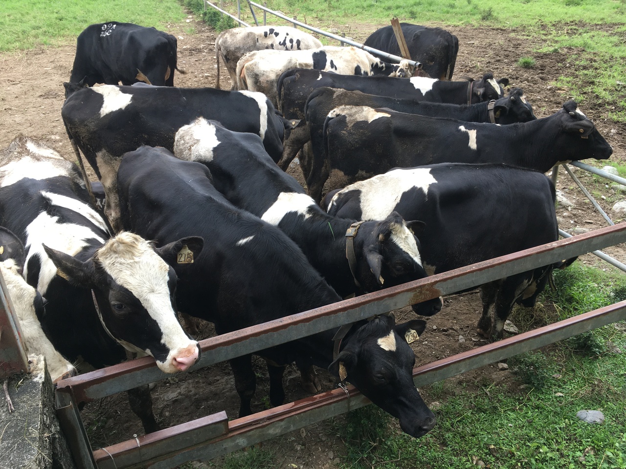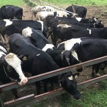 色が黒と白の乳牛をたくさん飼っている牧場です。牛がおなかがすいていたのか、私を見かけると大群で猛烈な勢いで寄ってきたので、人懐こい牛なんですが、ちょっと怖かったです。芝生などの草をあげると、食べていました。