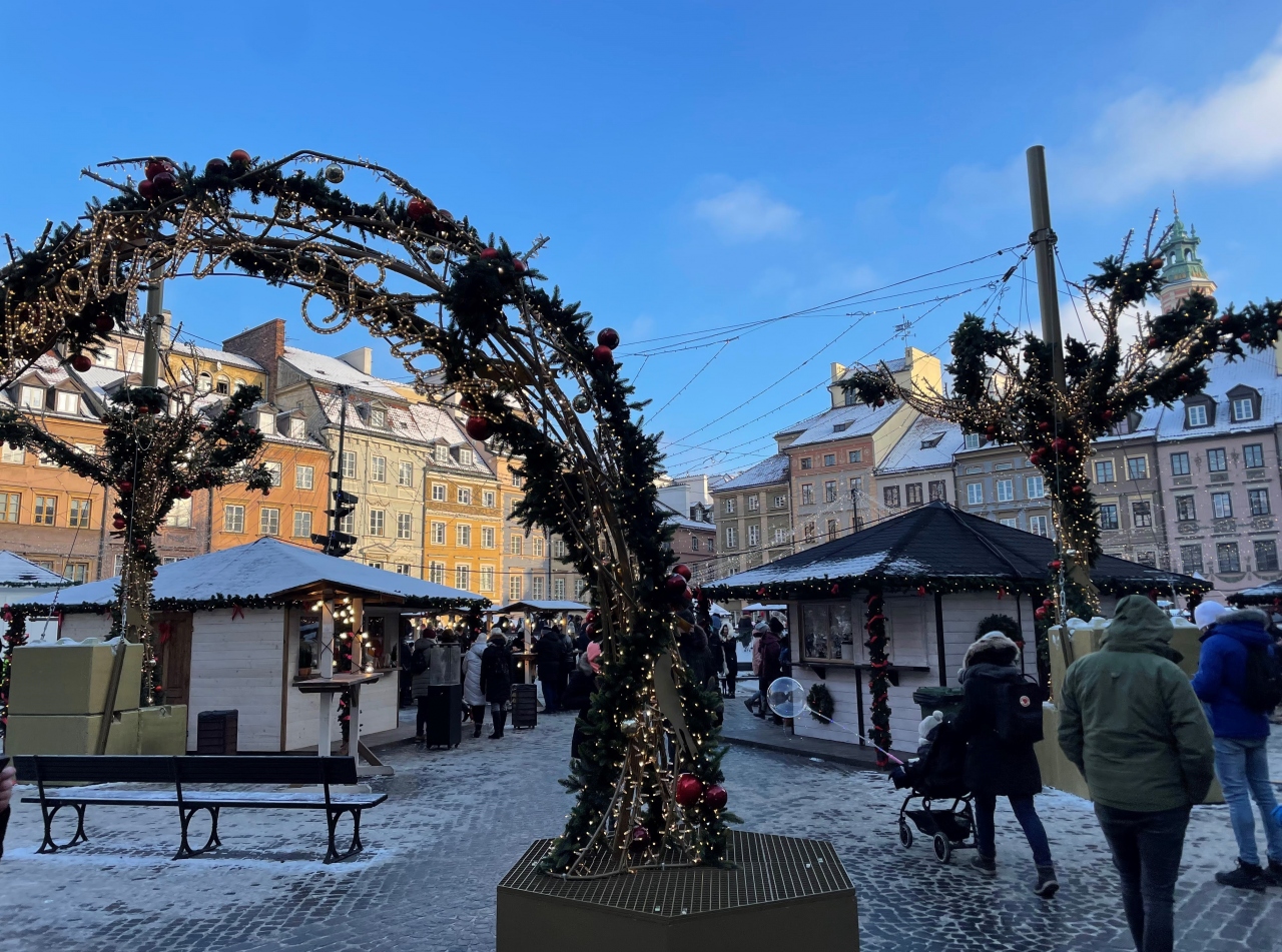 ワルシャワ歴史地区は昔のままの建物が残っている地区ではなく、昔の姿に復興した地区なので、雰囲気は歴史的でありながら、パステルカラーでかわいらしくキレイな建物が並んでいます。クリスマスの時期には旧王宮前と旧市街広場でクリスマスマーケットが開かれイルミネーションによってより素敵に見えます。