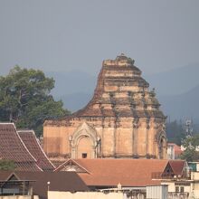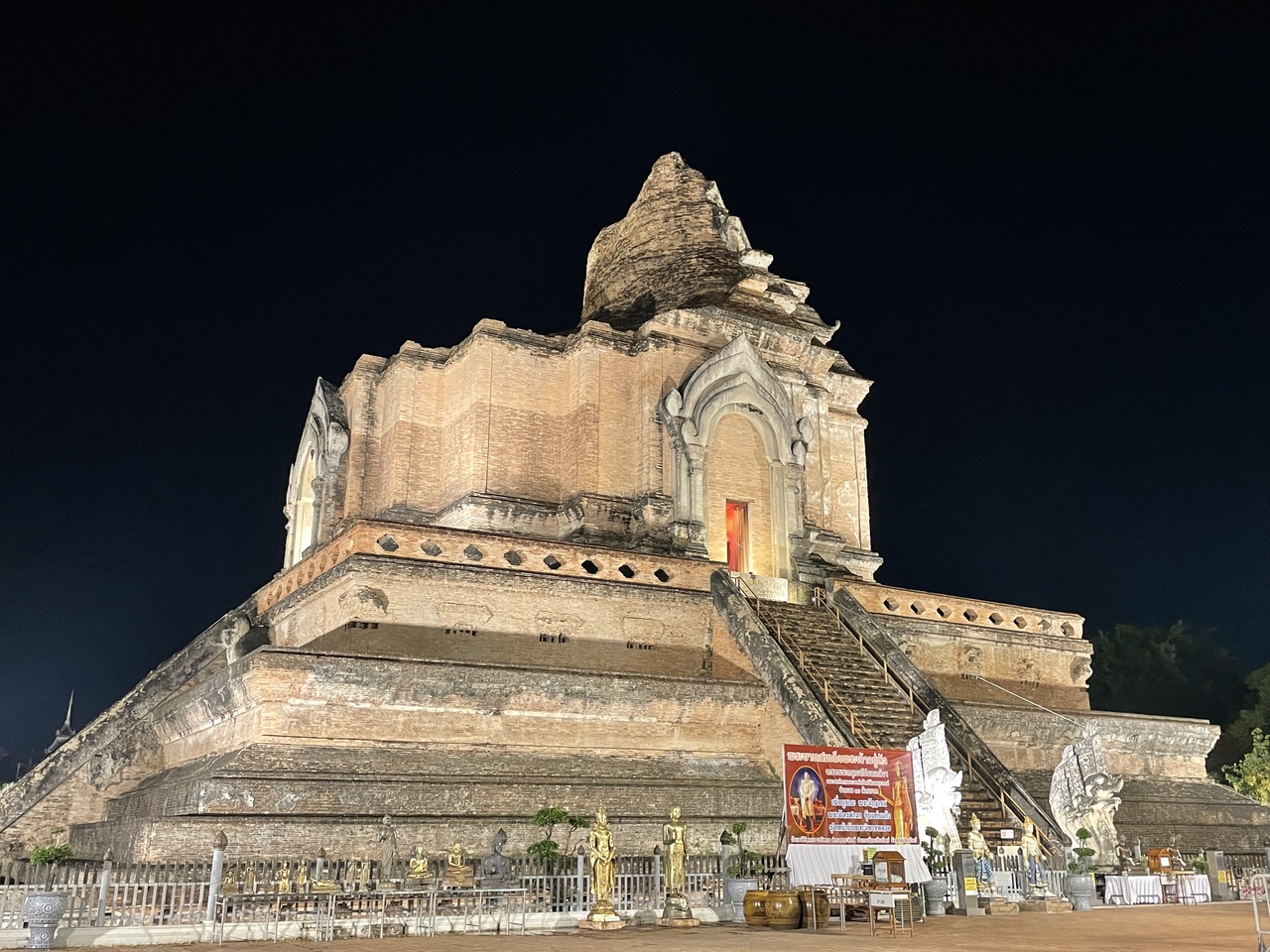 チェンマイの旧市街のほぼ中央にある寺院です。夜はライトアップが美しかったです。見る方向により、岩山のような景観で、街のランドマーク的なお寺でもあります。お堀の外側にあるホテルの客室からも眺めることができました。