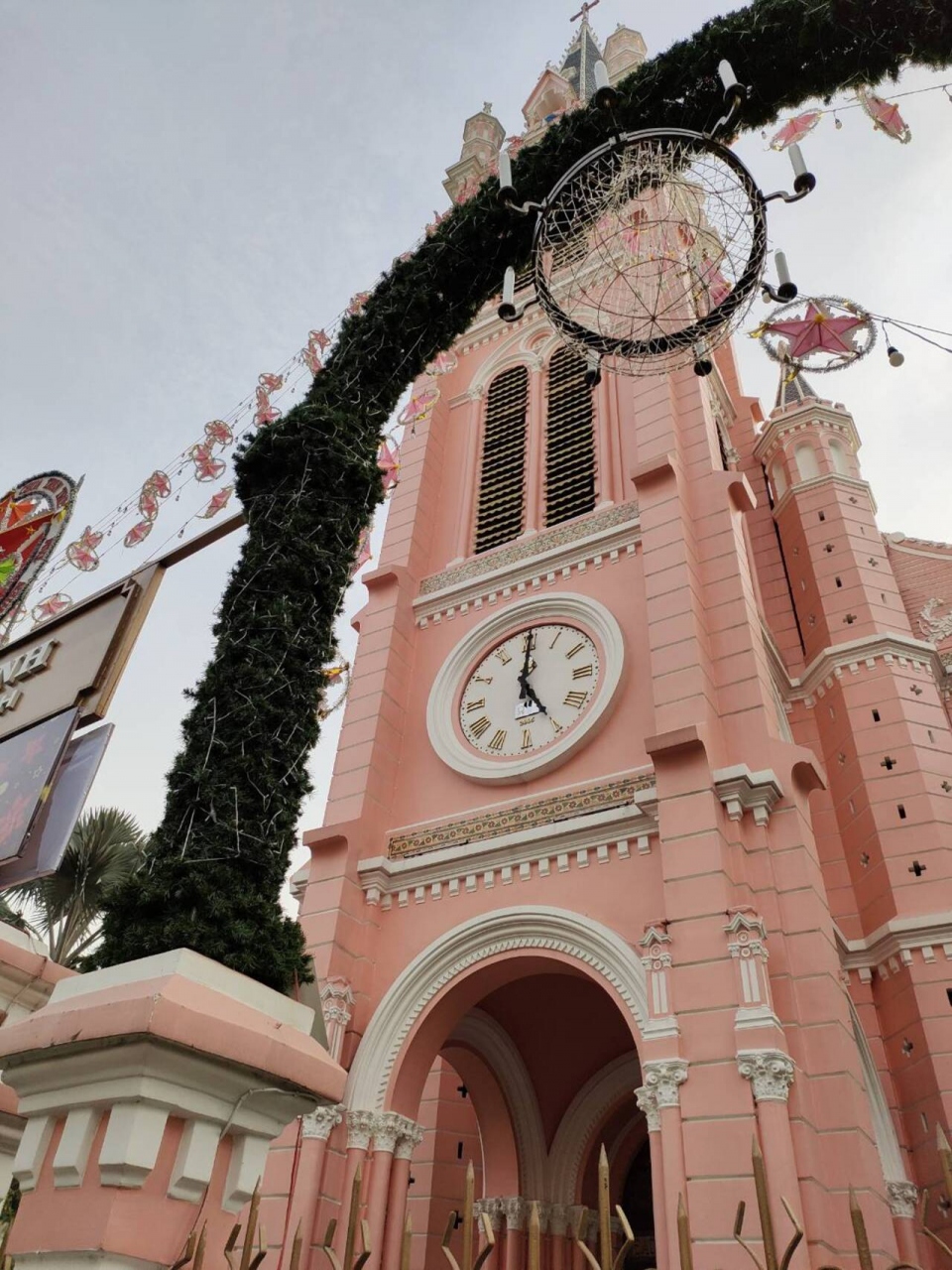 ホーチミンにある教会です。西洋風な時計がとりつけられていて、外壁も鮮やかなピンク色です。