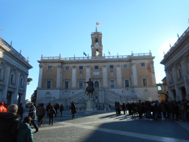 カンピドリオ広場はローマで最も神聖な丘に在るそうで、首都の語源のキャピタルです。16世紀教皇パウロ3世がミケランジェロに命じてデザインさせた幾何学模様の広場はルネサンス様式で、中央にはマルクスアウレリウス像のレプリカが飾られていました。