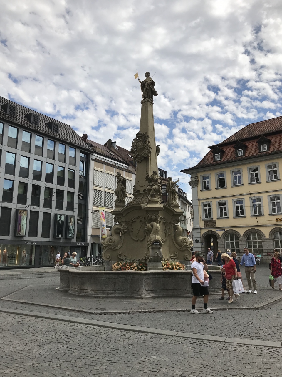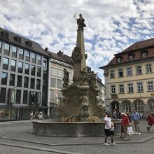 ヴュルツブルクのアルテ・マイン橋の手前にヴュルツブルクの市庁舎がありますが、その前にこのフィアレーレンブルネンという噴水がありました。噴水の真ん中の塔にはフランコニアの像があり、その周囲の4つの像は「賢明」「正義」「思慮」「勇気」の四つの美徳を表しているのだそうです。この辺りは人混みが多いので見逃さないようにしましょう。