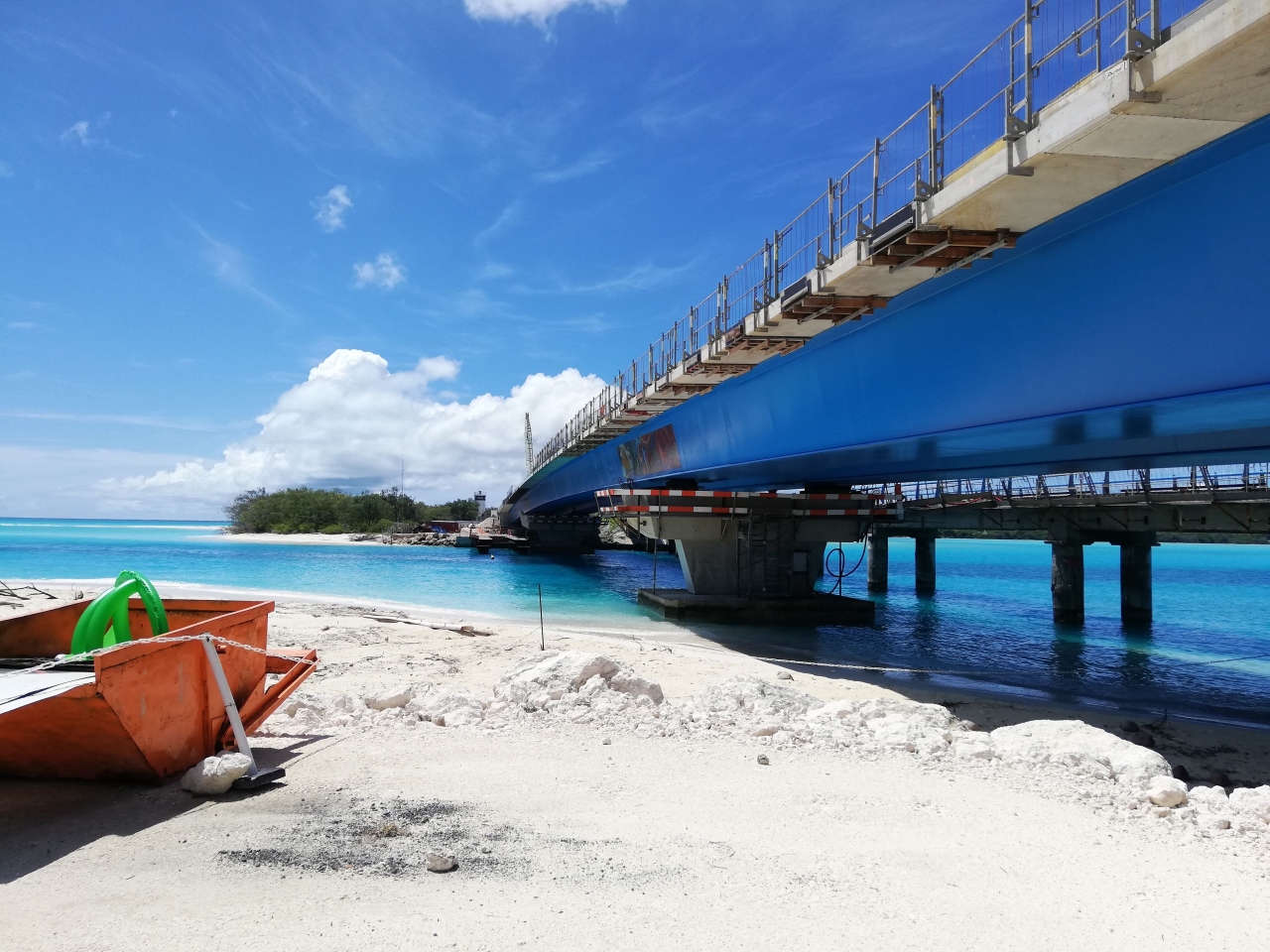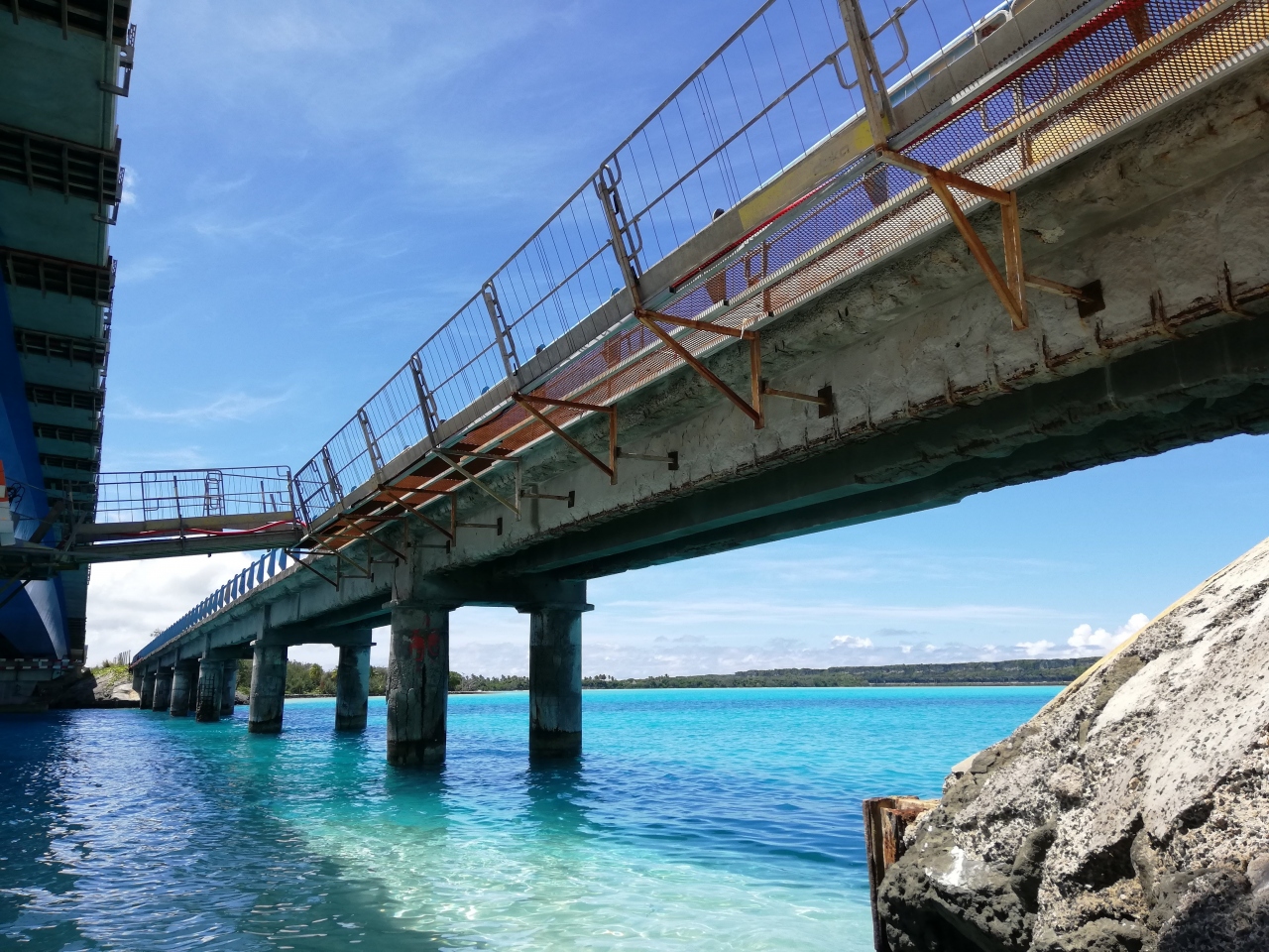 供用中の橋はコンクリート製で、下から見ると中の鉄筋が丸見えになるほど傷んでいた。誰もがすぐに架け替えないといけないと思うレベル。
