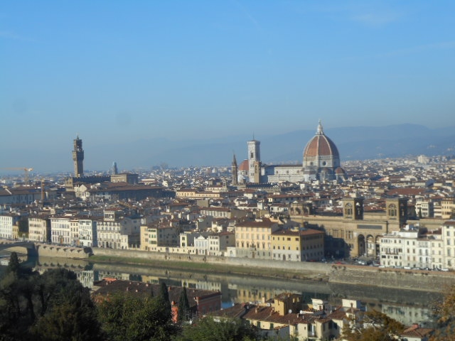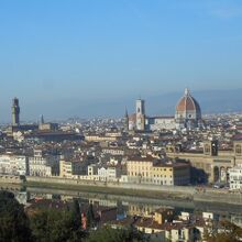 徒歩でフィレンツェを流れるアルノ川の橋を渡り、小高い丘の上のミケランジェロ広場に行きました。フィレンツェの街並みが望めるビィーポイントでした。広場中央にはミケランジェロのレプリカのダビデ像が在ります。土産物屋が並び、カフェ、レストランも在り休憩もできました。