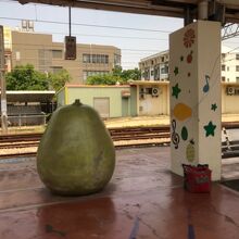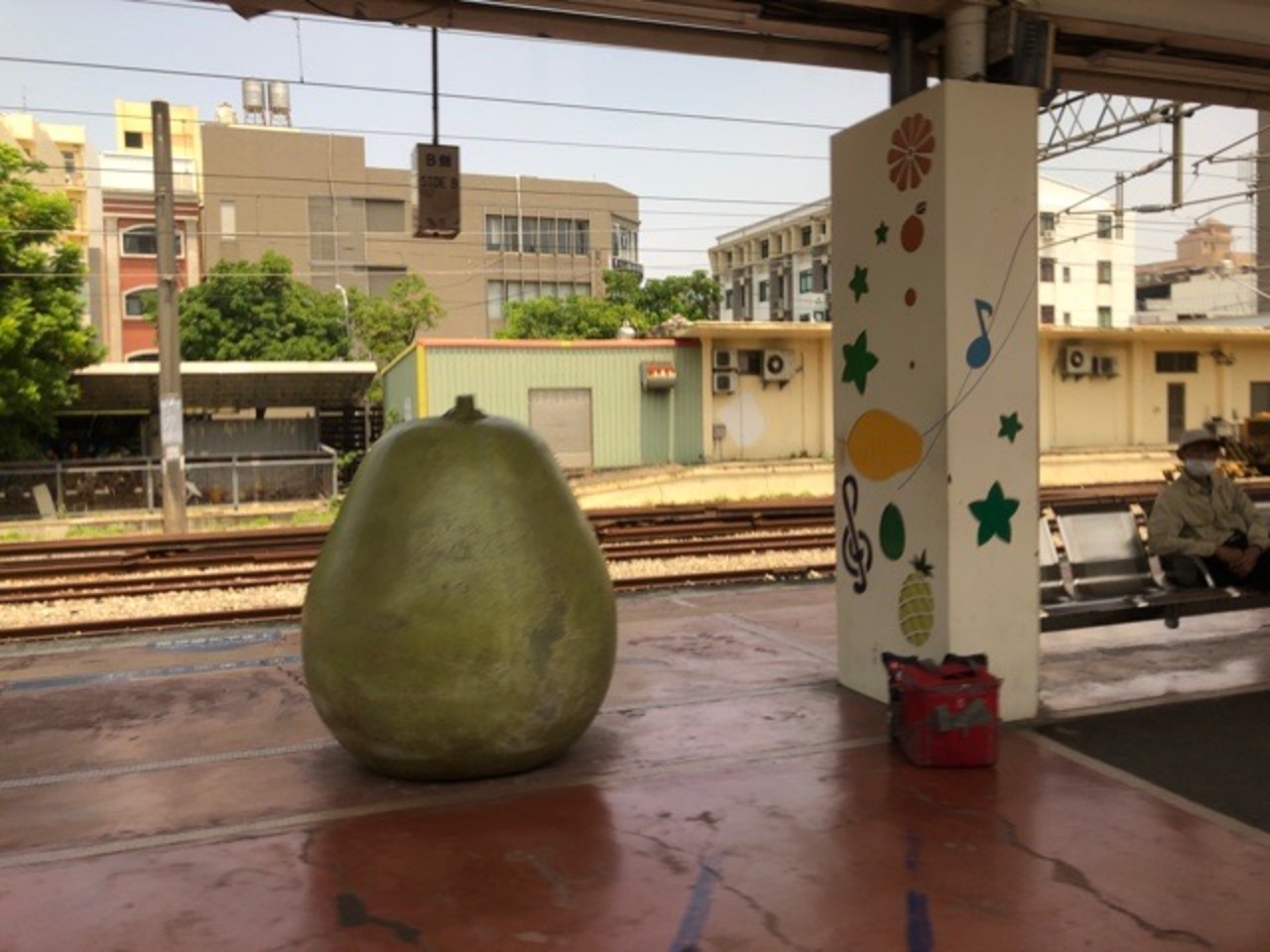 各駅列車でいったので、台北市内からなんだかんだ5時間くらいかかりました。到着する頃には、ものすごくお尻が痛くなっていました。席がなかったので仕方ないのですが、やはりここまで遠くなる時は、快速に乗ったほうがいいです。洋梨のベンチがありました