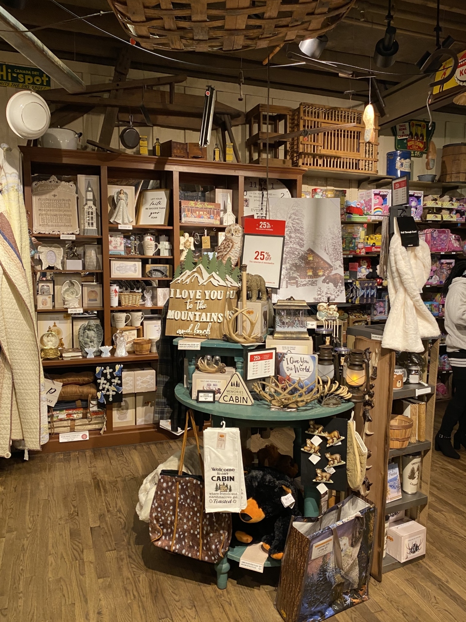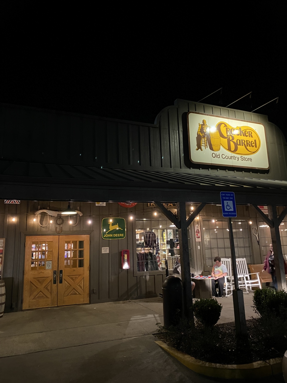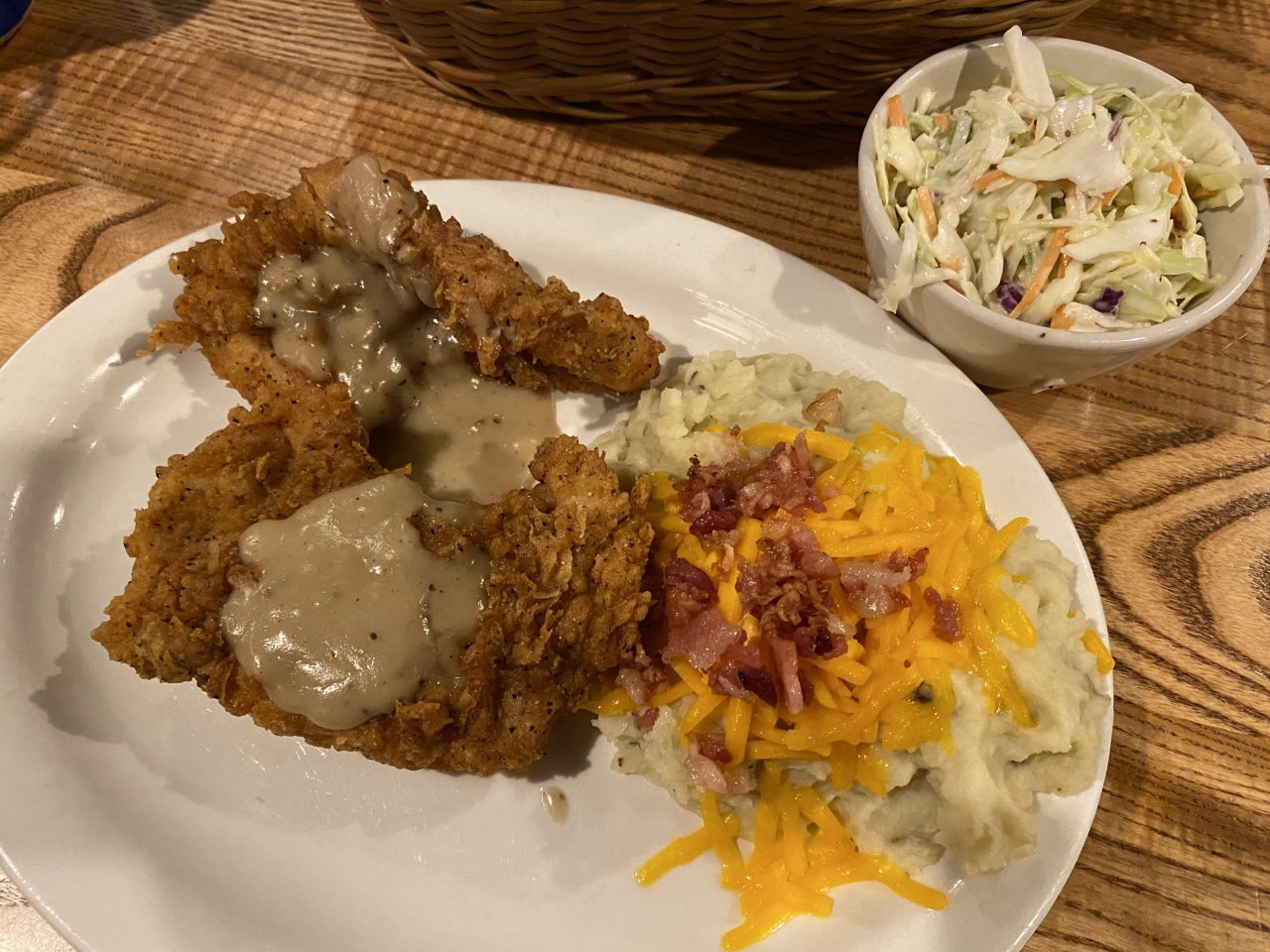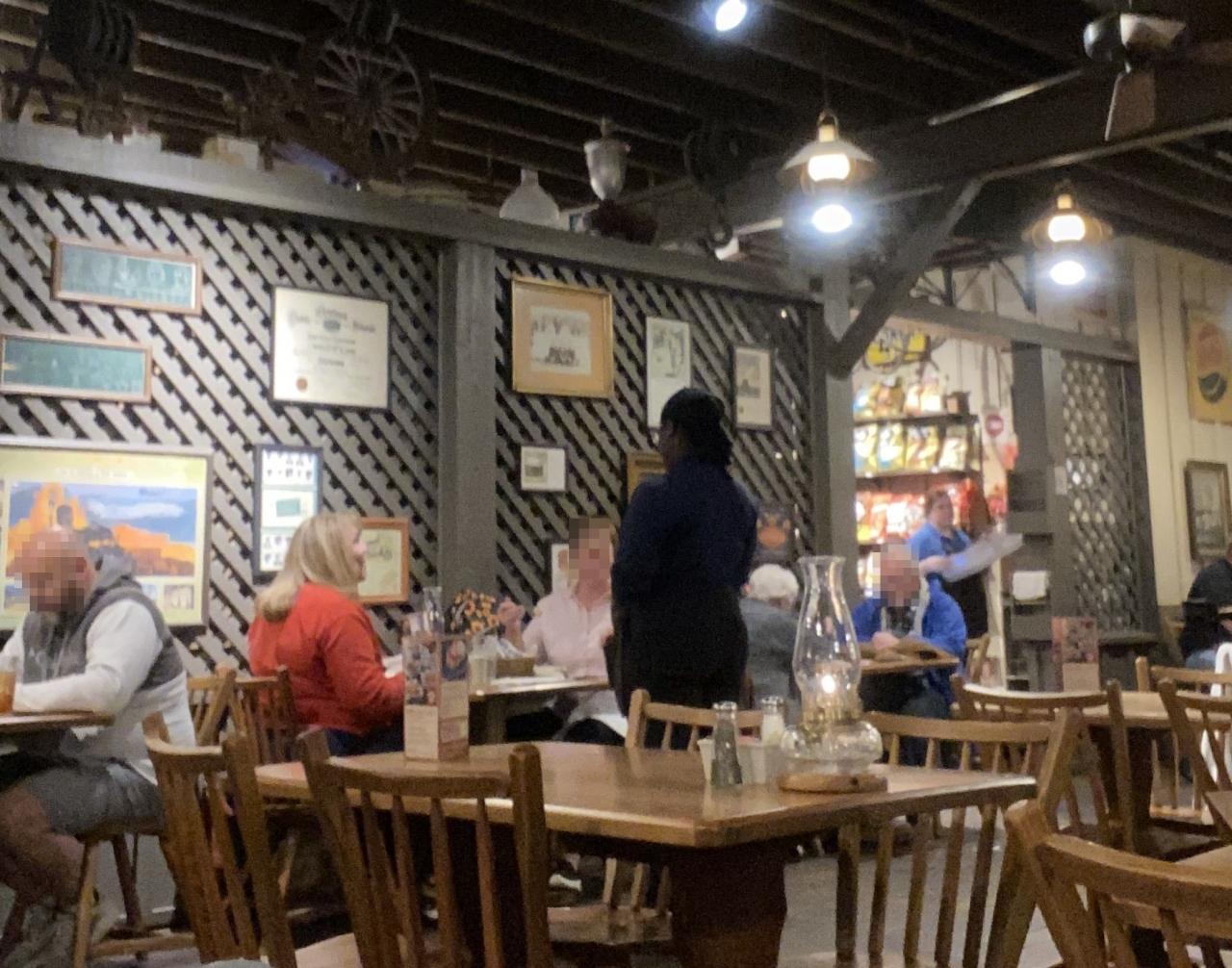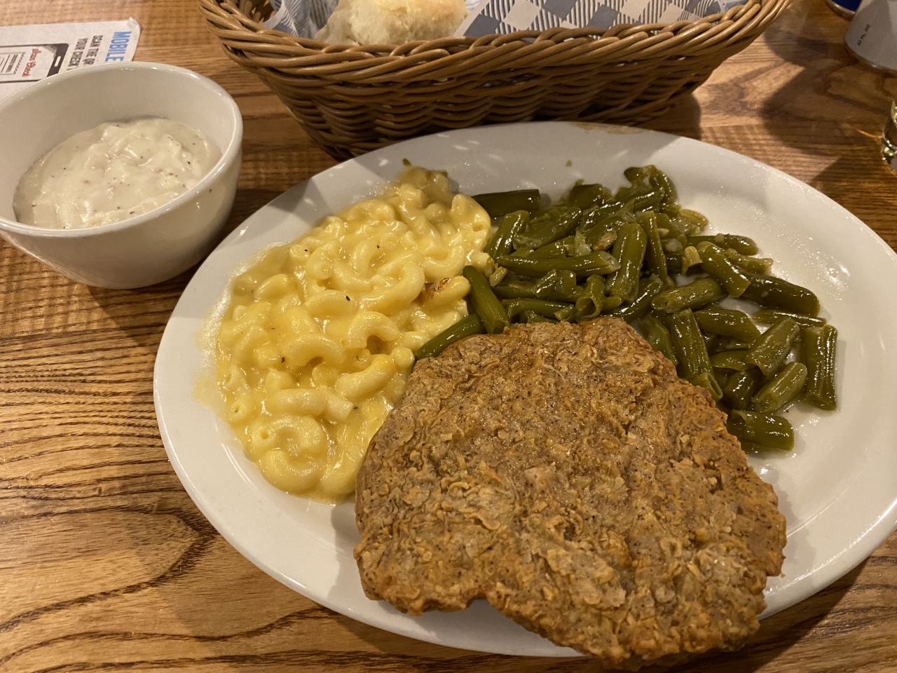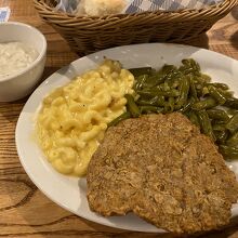 泊まったホテルから徒歩4分のところにあった「クラッカー・バレル・オールド・カントリー・ストア(Cracker Barrel Old Country Store)」でディナーしました。アメリカ南部料理のチェーンレストランです。普通は単に「クラッカー・バレル」と呼ばれるこのレストラン、どの店舗も雑貨(アメリカ南部のカントリー風?)売り場が併設されていて、なのでカントリー・ストアでもあるようです。人気のレストランだけに待ちがありました。受付に携帯TEL番号を伝えると順番が来ればTEXTメッセージで呼んでくれます。アメリカでよくあるスタイル。順番が来て着席。まずバターミルク・ビスケットが登場。私は「カントリーフライドステーキ」をチョイス。なんでも揚げる南部らしく、ステーキを揚げたメニューです。サイドにはマカロニ&チーズとカントリー・グリーン・ビーンズ。妻は「フライドチキン」をチョイス。ホームスタイルチキンにグレービーソースをトッピング。サイドはローデッド・マッシュポテトとコールスロー。”ローデット”とは”上に載っている”という意味で、この場合ベーコンとニンジンが載っていて普通のサイドより1.69ドル高くなります。ヘルシー志向などどこ吹く風の徹底した南部の揚げ物と、ザ・アメリカなサイドメニューの組み合わせは実に美味いのです。そんな料理をお手頃価格楽しめるクラッカー・バレルは、老若男女で賑わう人気のレストランです。