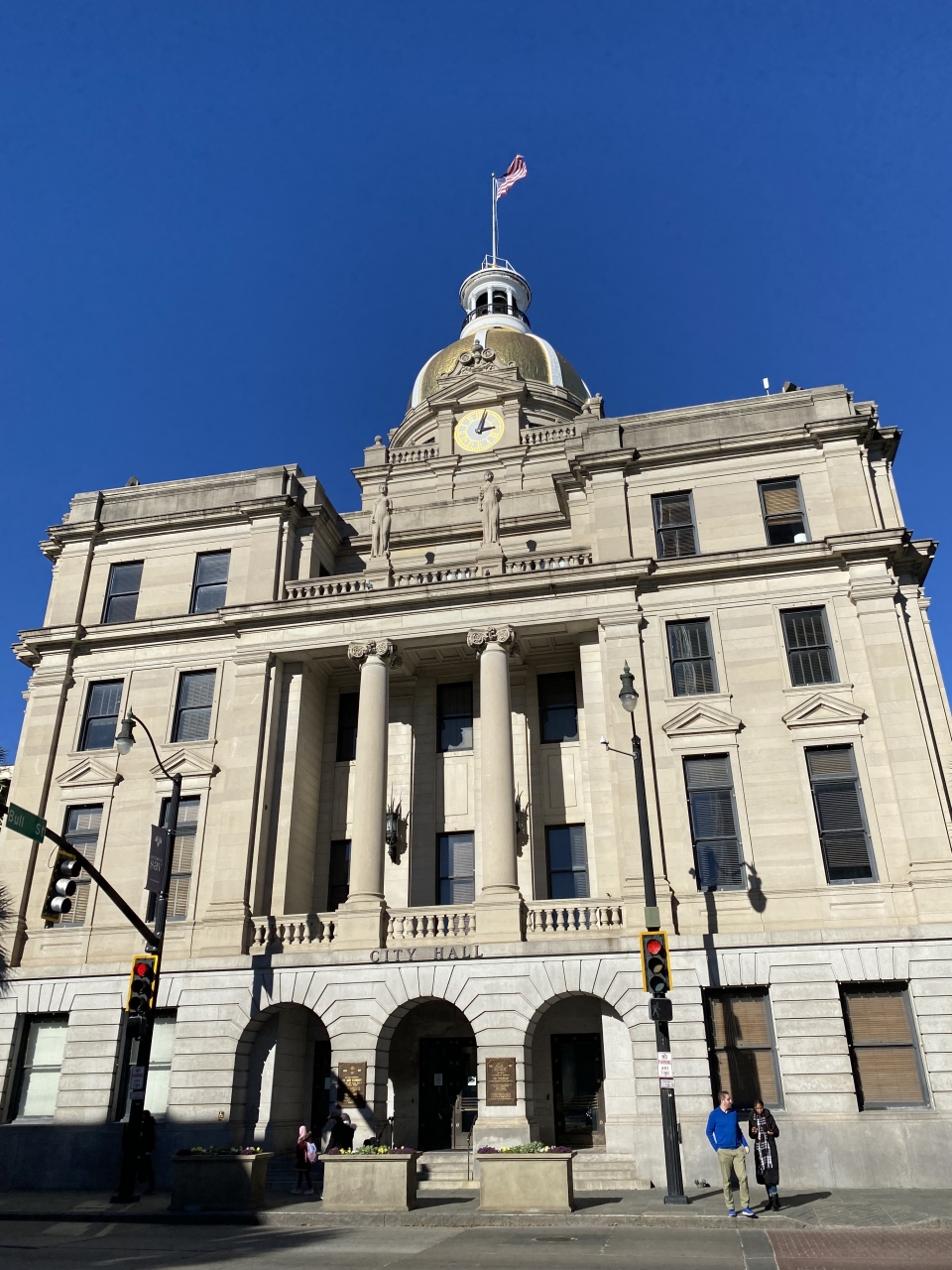 ブル・ストリートをウオーターフロント地区へ向かうと「シティ・ホール」にぶつかります。1905年に建てられたルネッサンスリバイバル建築、ハイマン・ウィットカバーというサヴァンナでは有名な建築家によるものだそうです。訪れたのは土日で開いておらず、外観のみ見学しました。