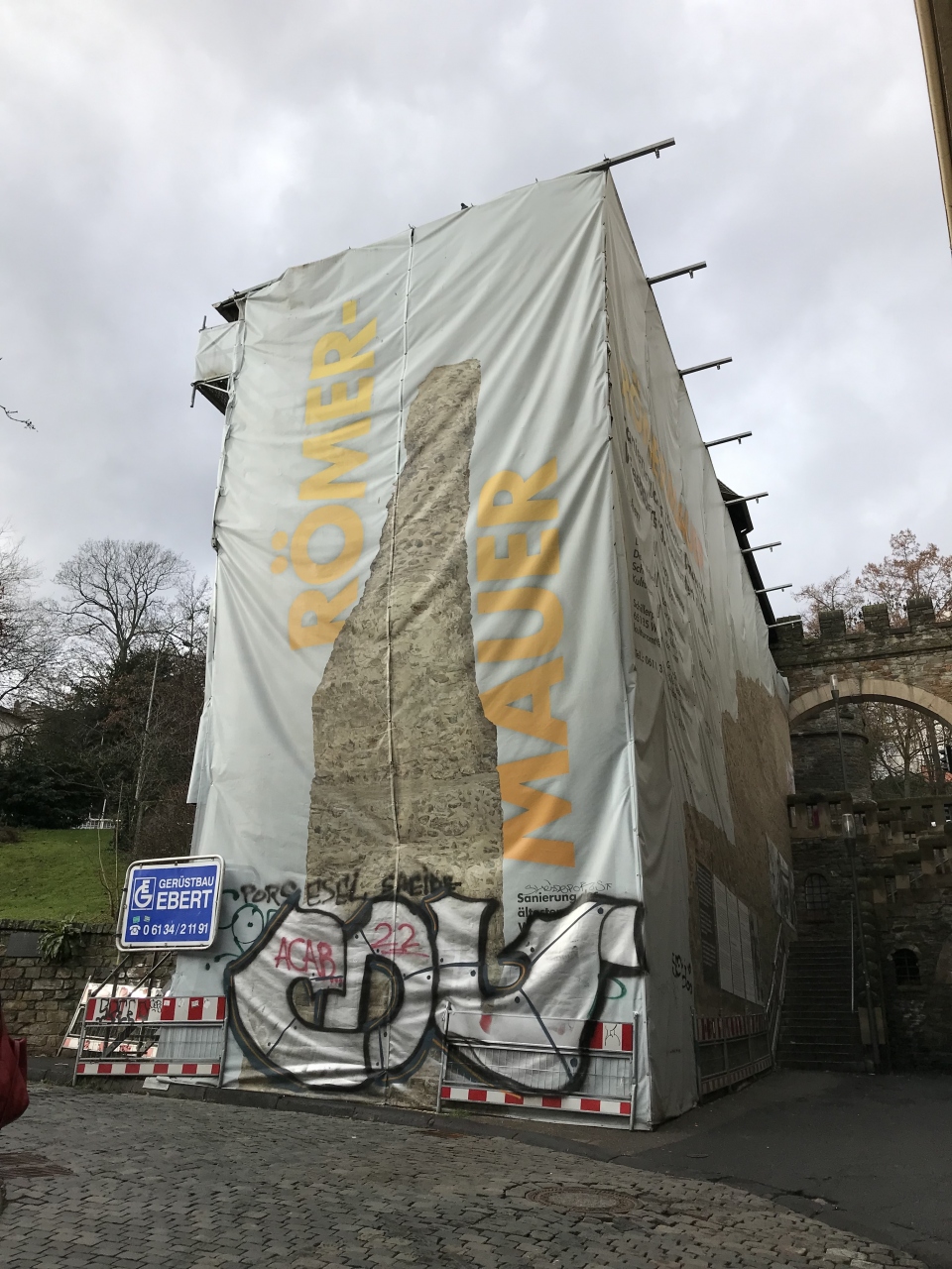 ヴィースバーデンの市街を散策している時に見つけました。皇帝ヴァレンティニアヌスの時代に建てられたローマの記念碑だそうですが、修復修理中で布で覆われていて、全体を見ることはできませんでした。ローマがヴィースバーデンを占領した記念碑だそうです。