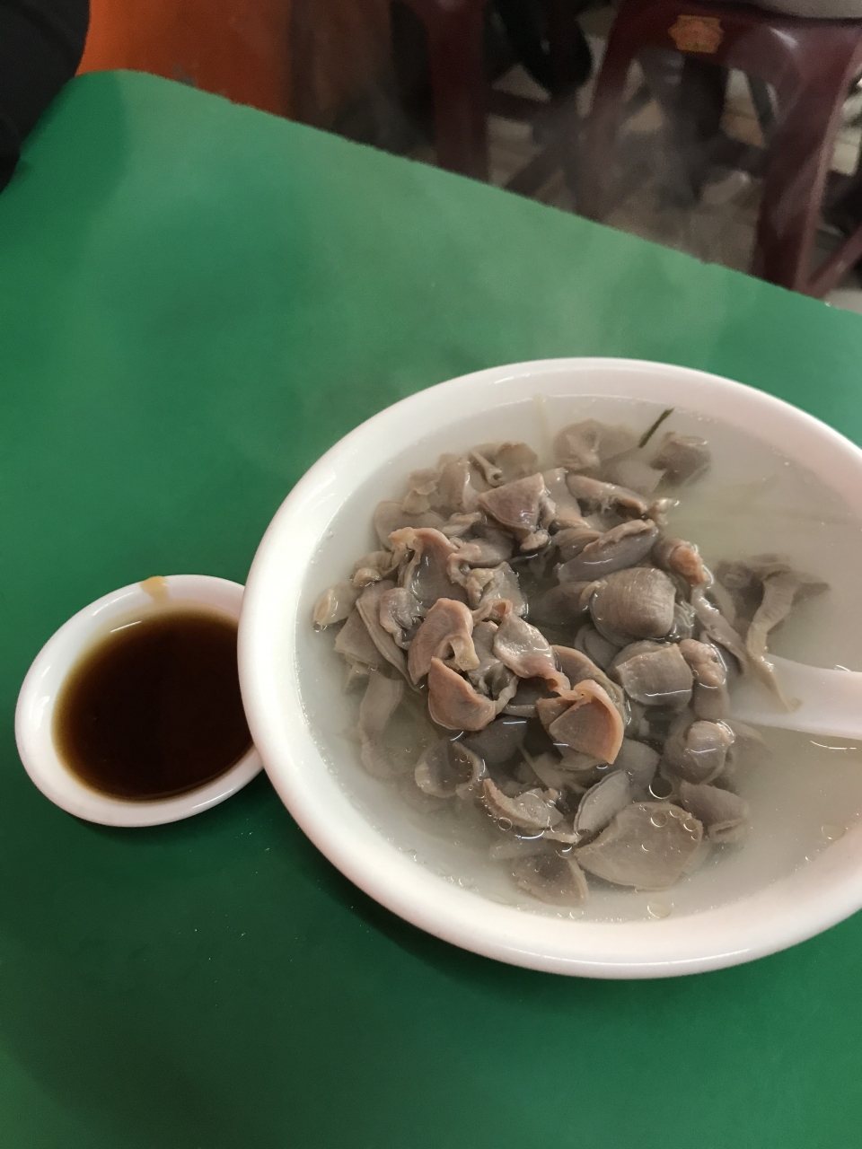 五郎さんオーダーの下水湯も注文。日本人にとってはギョッとしますが、「下水」とは鶏や鴨などの内臓を表す言葉で、こちらは砂肝の下水湯でした。砂肝はコリコリしていて生姜が香る優しいスープでした。