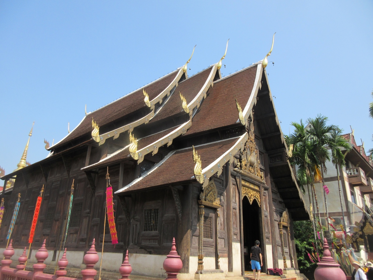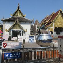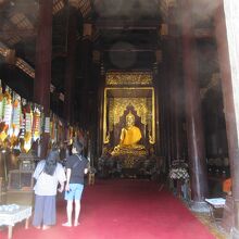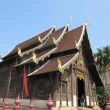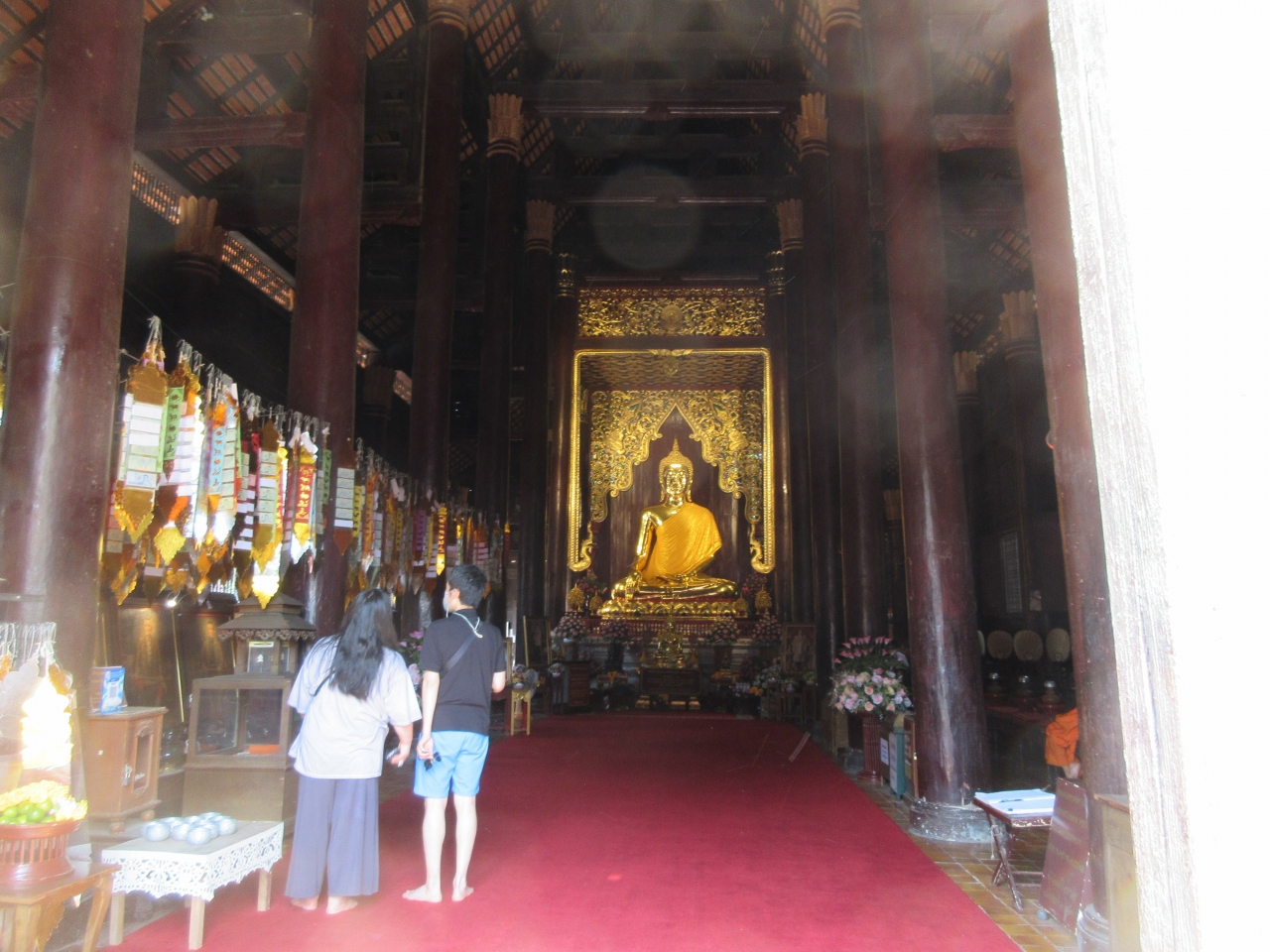 旧市街中央を南北に走るプラポックラオ通りに面しています。ワットプラシンと並んで格式の高い寺院だそうで、お堂の入り口は蛇神やクジャクの装飾で飾られ、内部には巨大な仏像があります。私が訪れた時にも多くの観光客がきていました。拝観料がかかります。