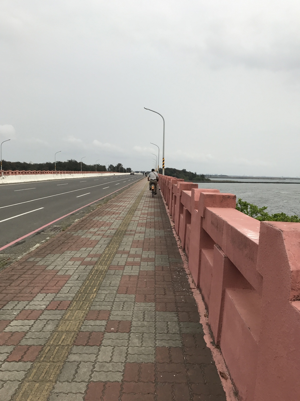 google mapでは自転車の所要時間がずいぶん短く表示されますが、実際には知った道ではないので思ったより時間がかかると思った方が良いです。安平樹屋付近から出発し、途中同記安平豆花のお店の前を通ったので帰りはあそこでおやつを食べる!を目標に走りました。平日の午後だったからか、四草大橋、四草大道は車がほとんど走っていなくて自転車で走りやすかったです。ただ、当日(4月19日)は暑くて水分補給は必須です。