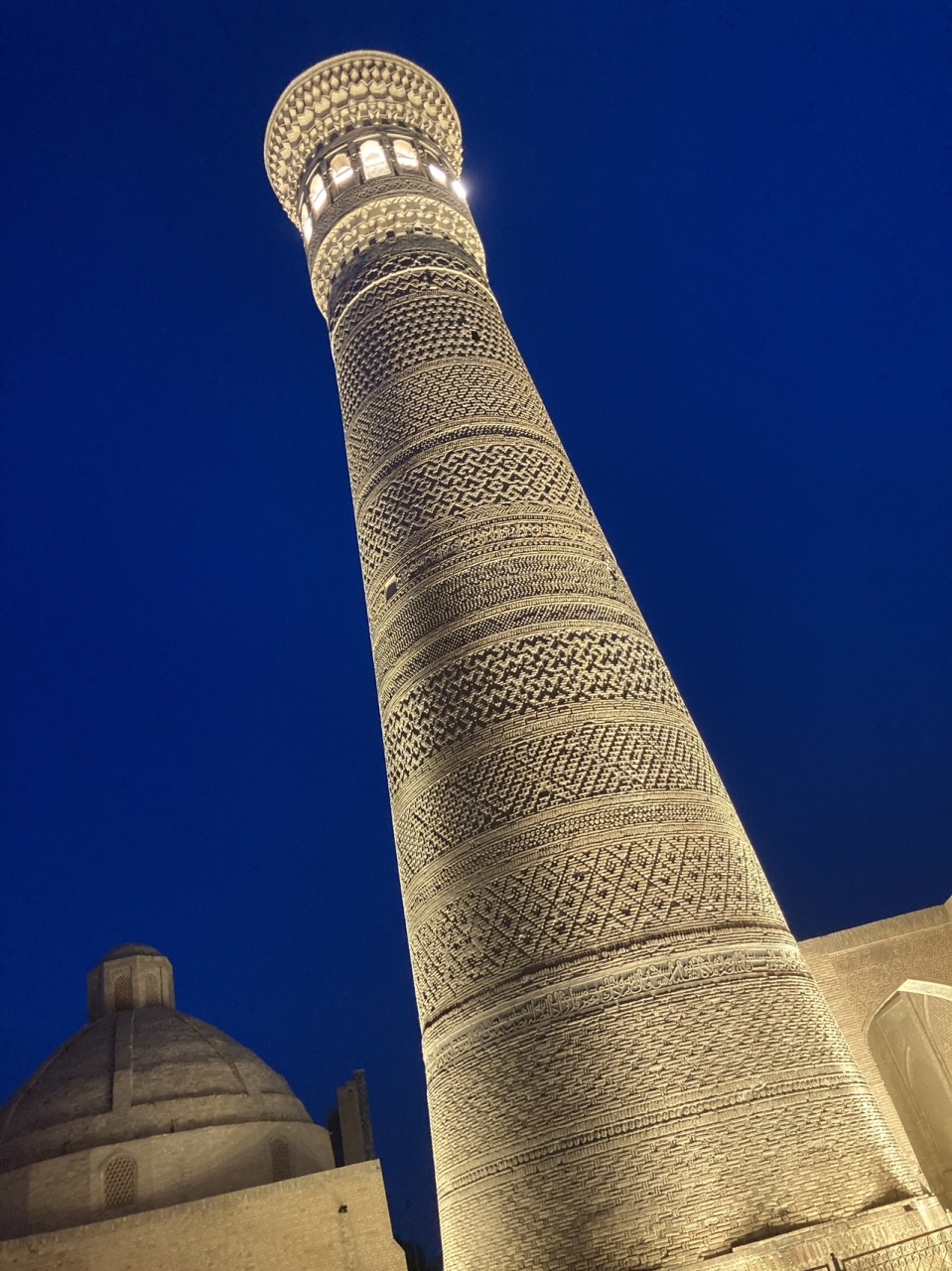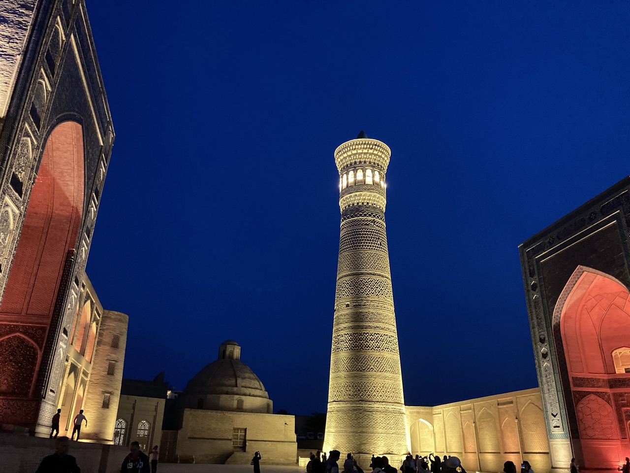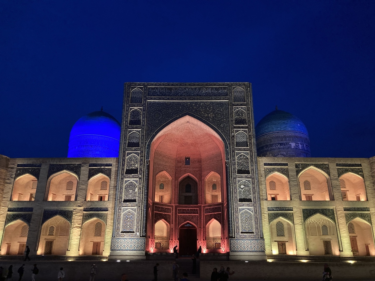 昼間も見に行きましたが、夜のライトアップが特に素晴らしかったです。模様が浮かび上がるようなライティングがとても良いです。すぐそばのモスクとメドレセも合わせて、広場がとても幻想的な光景になります。ブハラで一番印象に残りました。