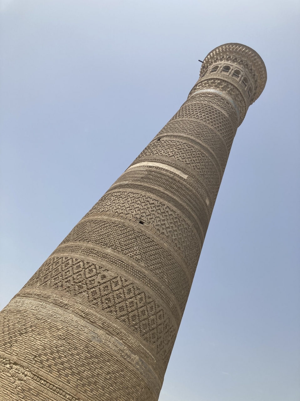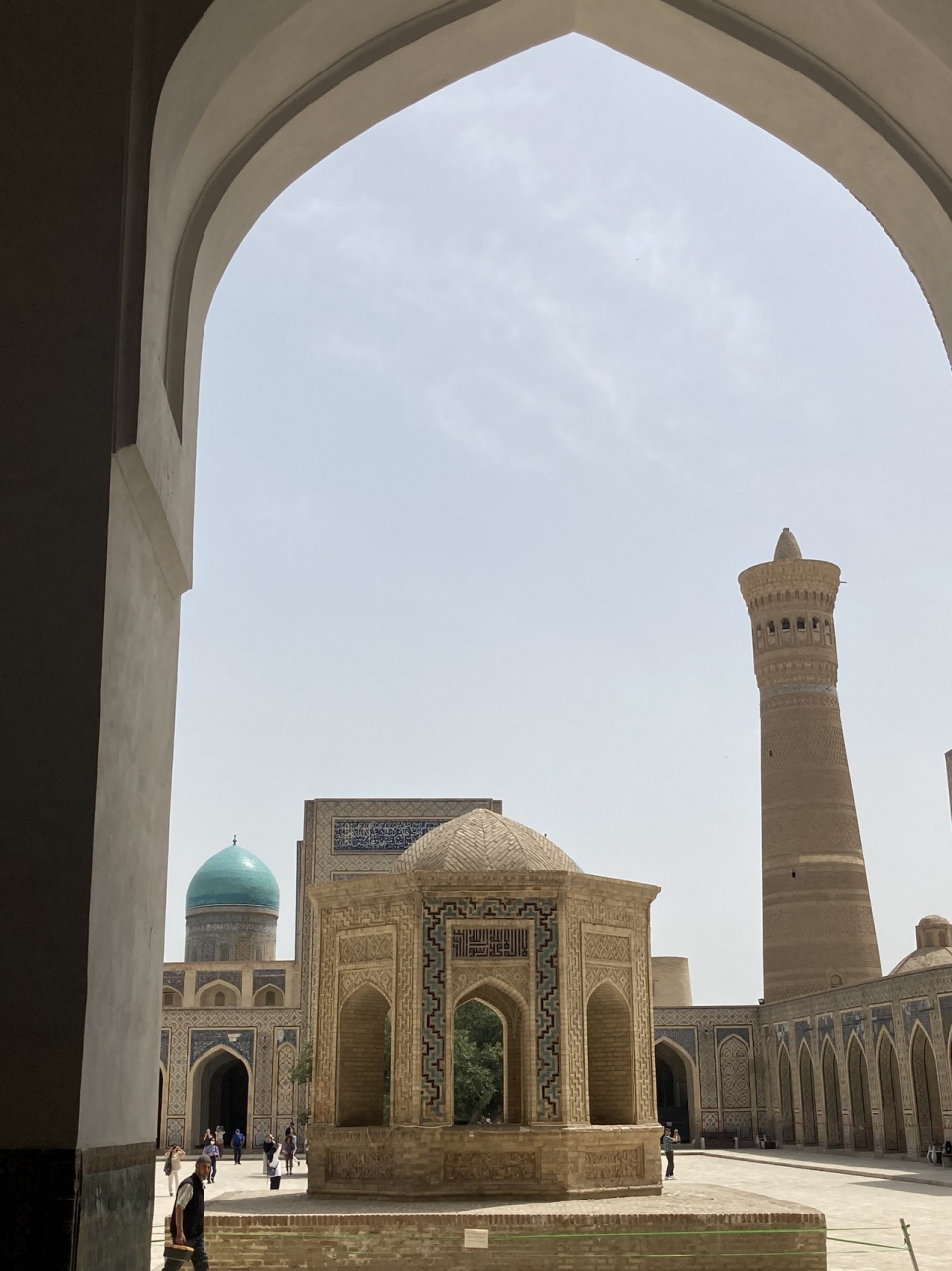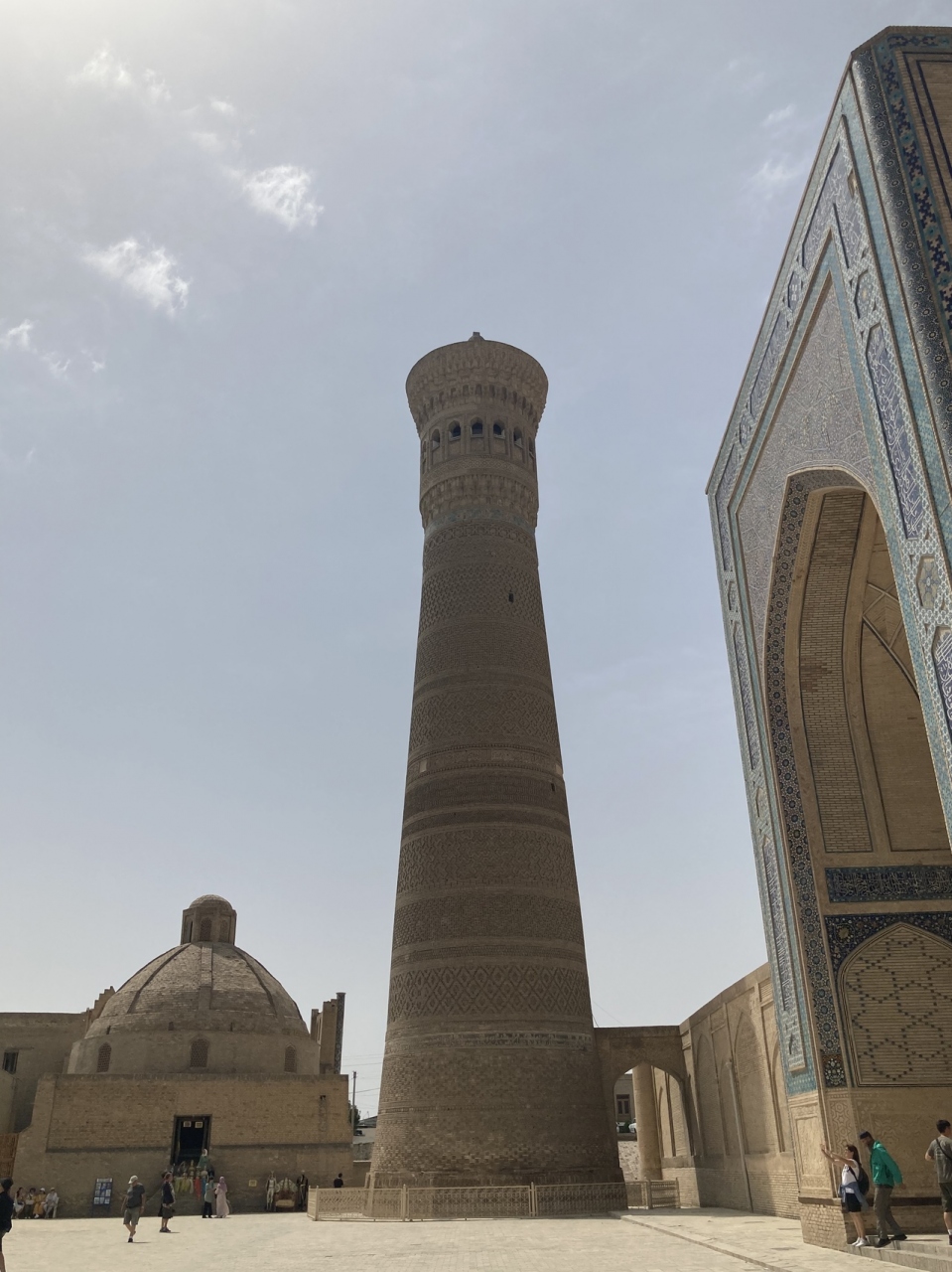 昼間も見に行きましたが、夜のライトアップが特に素晴らしかったです。模様が浮かび上がるようなライティングがとても良いです。すぐそばのモスクとメドレセも合わせて、広場がとても幻想的な光景になります。ブハラで一番印象に残りました。