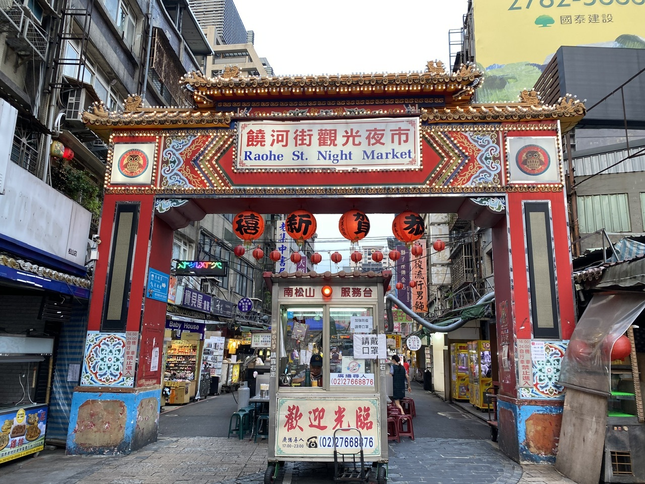 MRTの松山駅、台湾鉄道の松山駅からもどちらからも近い。入り口には大きな廟もあり、夜はライトアップされてとても綺麗