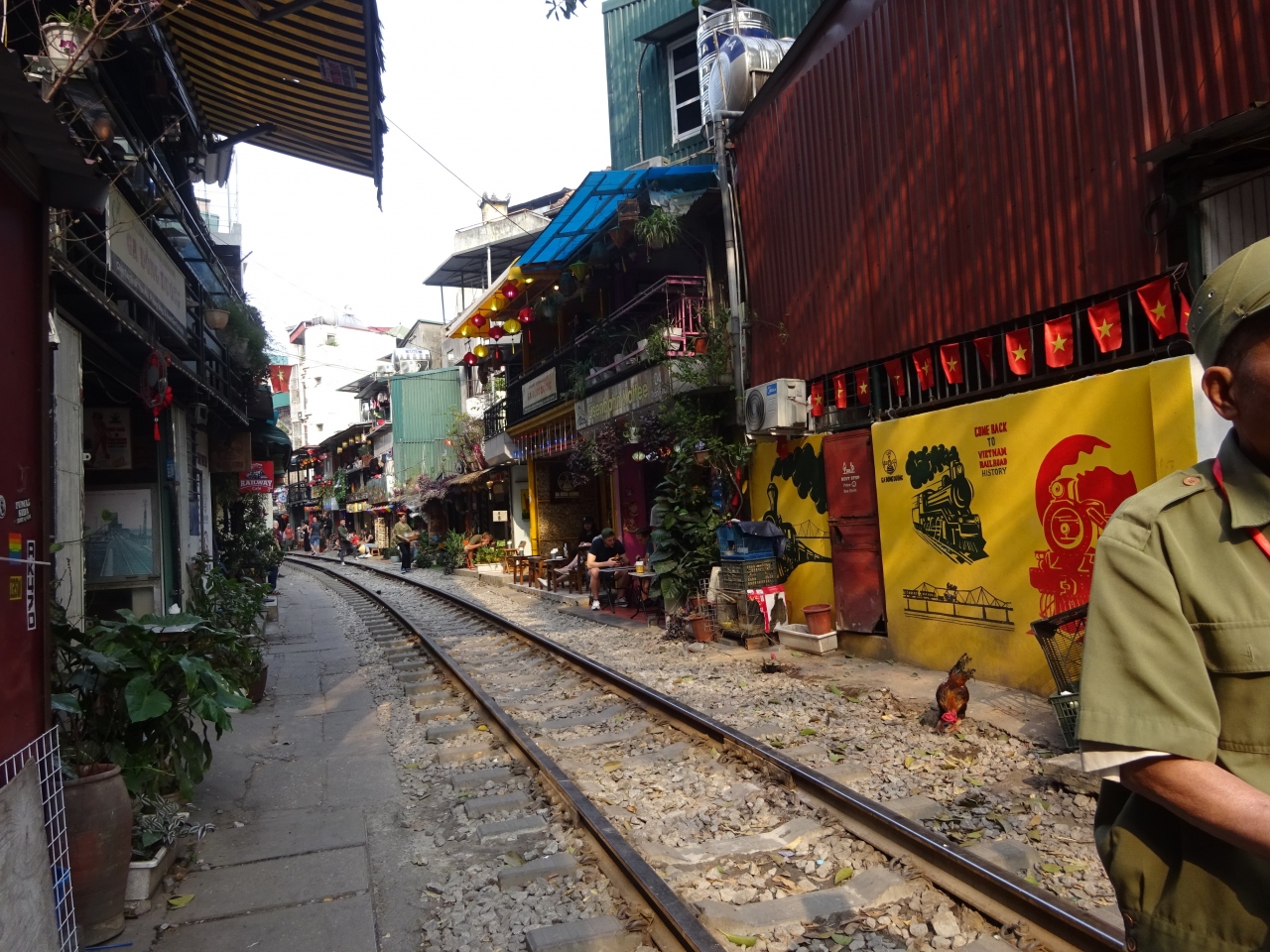 ハノイのトレインストリートです。警備の方がいらっしゃって、入ったらダメ!というかんじですが、逆方向を見ると大勢の方が線路上を歩いていたりします。トレインが来る時間になったら出ないといけないなど、何かあるようです。地元の方の線路上での生活風景がかいまみられます。