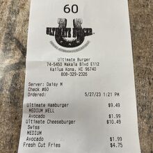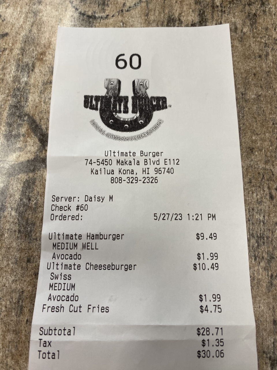 念願のアルティメイトバーガーに行くことができました。ハワイの牧草を食べて育ったビーフを使ったパテは熱々肉厚ジューシーで美味しかったです。焼き方もお好みを聞かれますのであらかじめ考えておいた方が良いですね。オーダーしてからテーブルに運ばれてくるのに10分弱かかりましたが十分に待つ価値はあります。フレンチフライも細身でちょっとしなやかな揚げ具合で個人的にはかなりはまりました。特にガーリックの効いたソースが良かったです。
