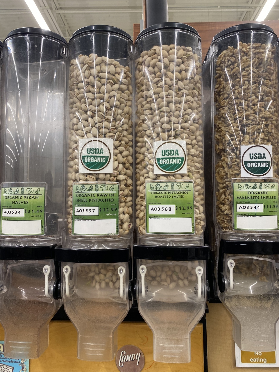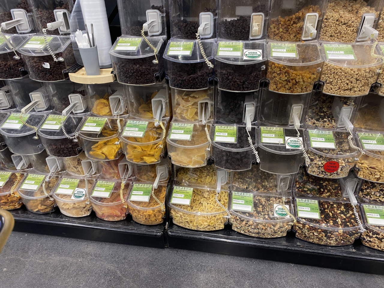ハワイ島のオーガニックを扱うお店の代表格。カイルアコナ店は2022年に現在の場所(コナコモンのスポーツオーソリティの跡地)に移転したようです。ハワイ島の東側のヒロにも店舗がありますが、ヒロに比べてとにかく広く、何よりも清潔感がありました。様々なオーガニックフードがありますが、ナッツ、ドライフルーツ、チョコレートなどの量り売りの種類の多さにびっくりしました。
