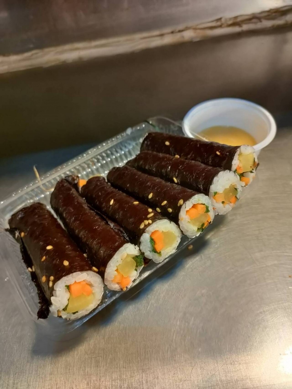 キンパッを食べましたが、具材の歯ごたえもたのしくてあっという間に食べてしまいました。ごま油の風味がおいしい海苔でした。