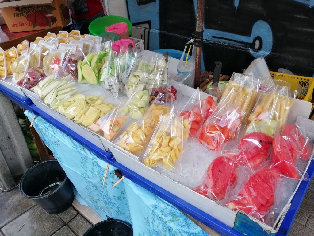 食べやすく1口大に切ったフルーツを売っている屋台がありました。スイカやパイナップル、パパイヤなどいろいろな種類の旬のフルーツが売られていて、1袋20バーツでした。