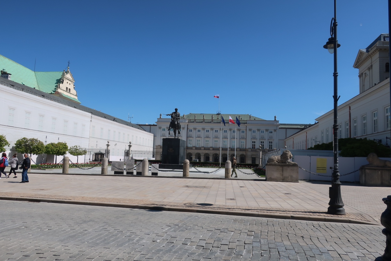 王宮広場から南に向かうクラコフ通りにある元宮殿は、今は大横領官邸として使われています。大統領官邸前には、軍人ユゼフ・ポニャトフスキ大公の騎馬像が建っています。